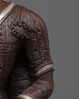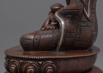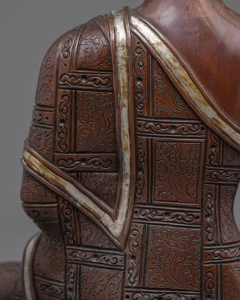 The Shakyamuni Buddhas Body Art is a masterpiece of craftsmanship created by skilled artisans from Nepal. The statue is made of oxidized copper, chosen for its ability to radiate a sense of serenity. The statue depicts the Buddha seated in a meditative pose on a moon disc lotus seat, holding an alms bowl in his left hand and his right hand in the earth-touching mudra, symbolizing his enlightenment. The statue also features intricate and detailed design patterns on the robe with a little touch of silver, which results from the traditional Himalayan molding method. This method takes months to complete and is passed down through generations. This unique and striking statue would be a perfect addition to any meditation or yoga practice or as a gift for a Buddhism or Yoga practitioner who appreciates this statue's beauty and serenity.