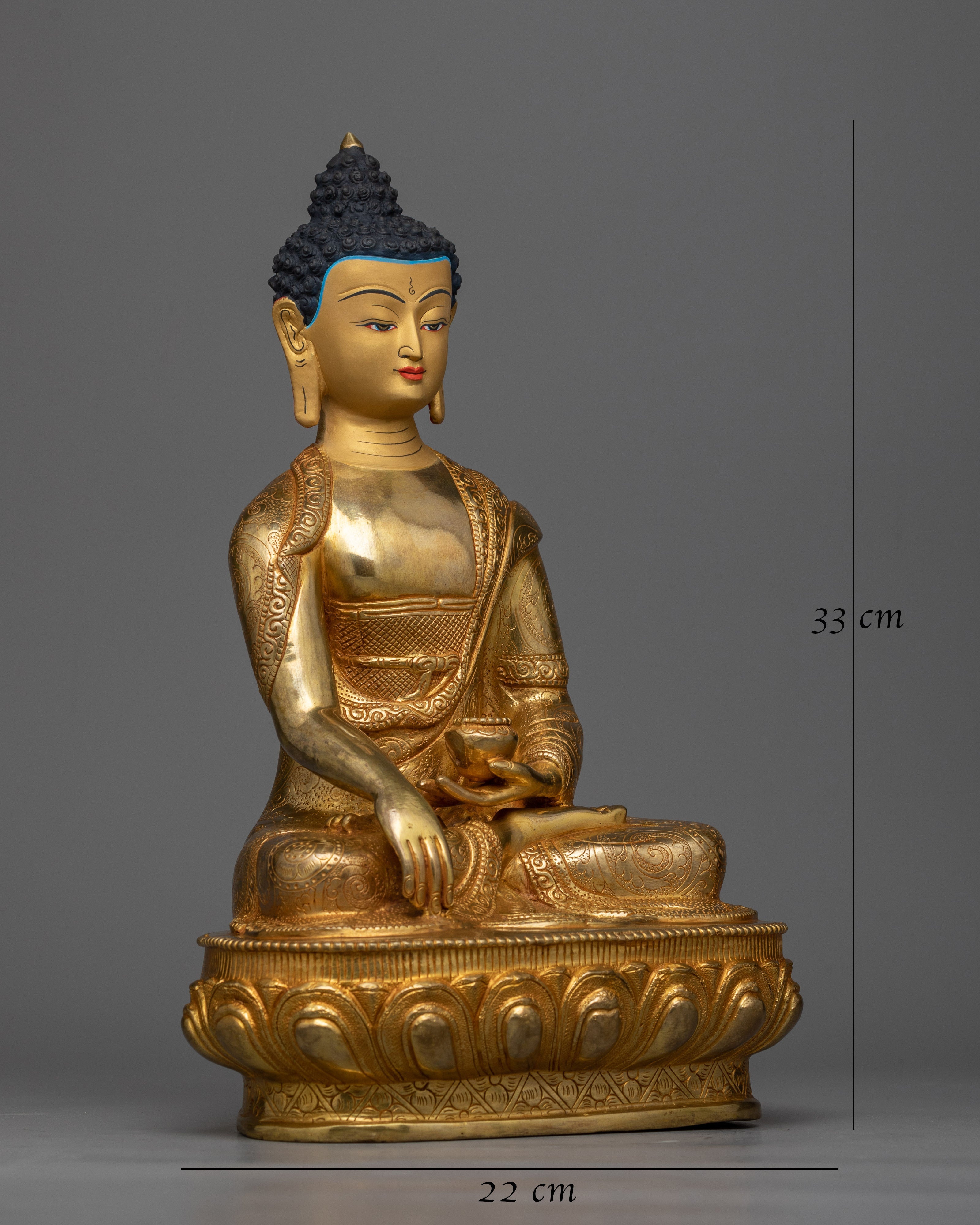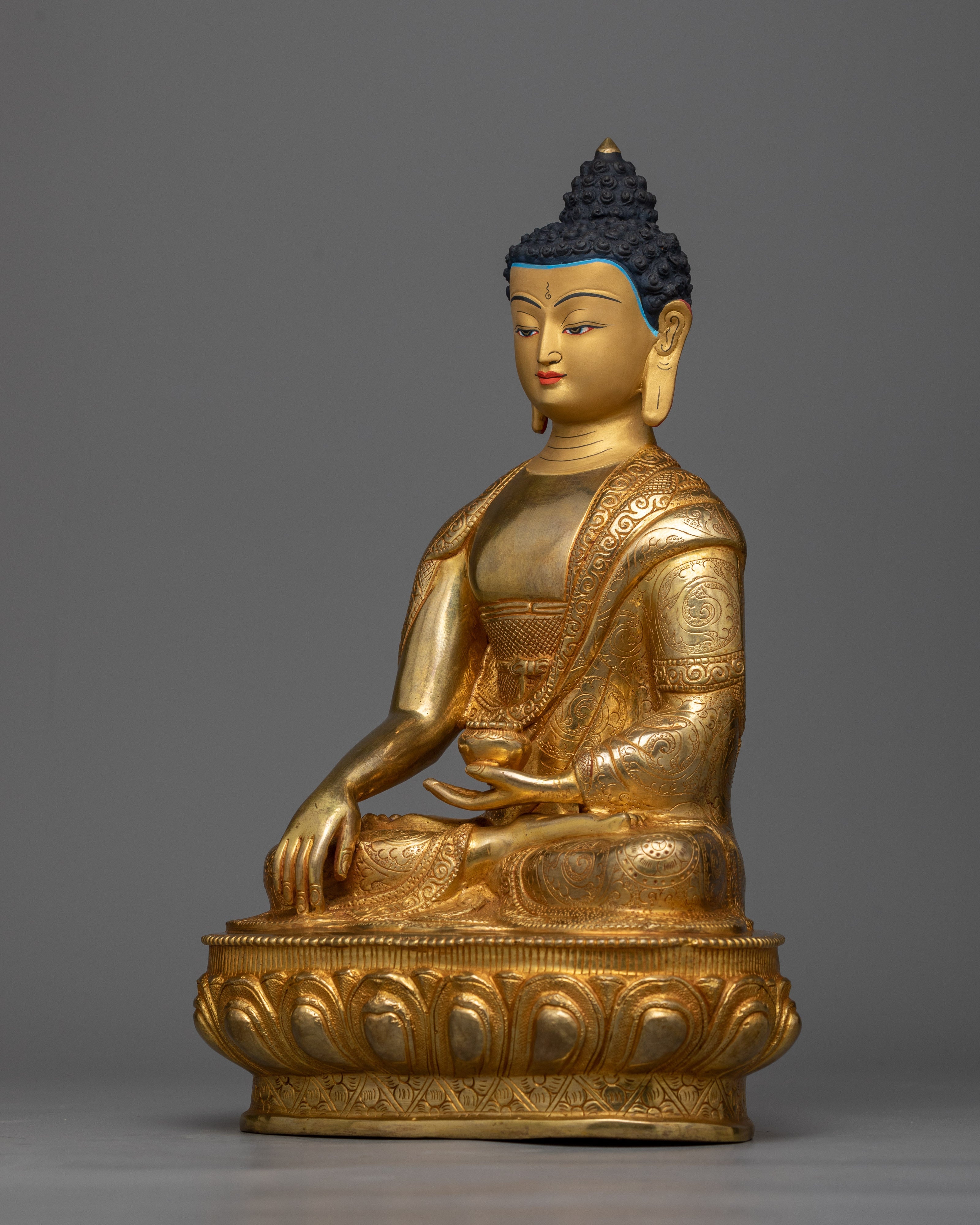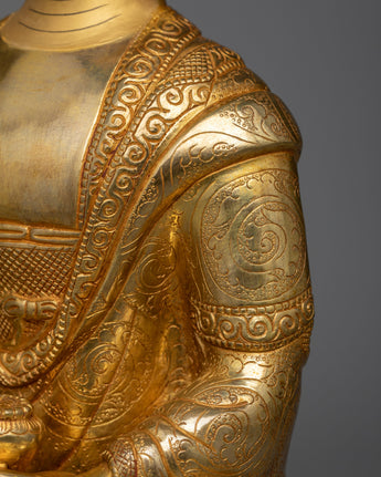 This sculpture is made of copper, which is known for its endurance and spiritual resonance, and is gilded in 24K gold. This rich polish reflects Buddha Shakyamuni's enlightened state and gives the statue a brilliant gloss. The intricate gold and acrylic paintings highlight the Buddha's tranquil look and the precise features of his monk's robe.