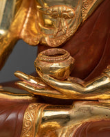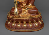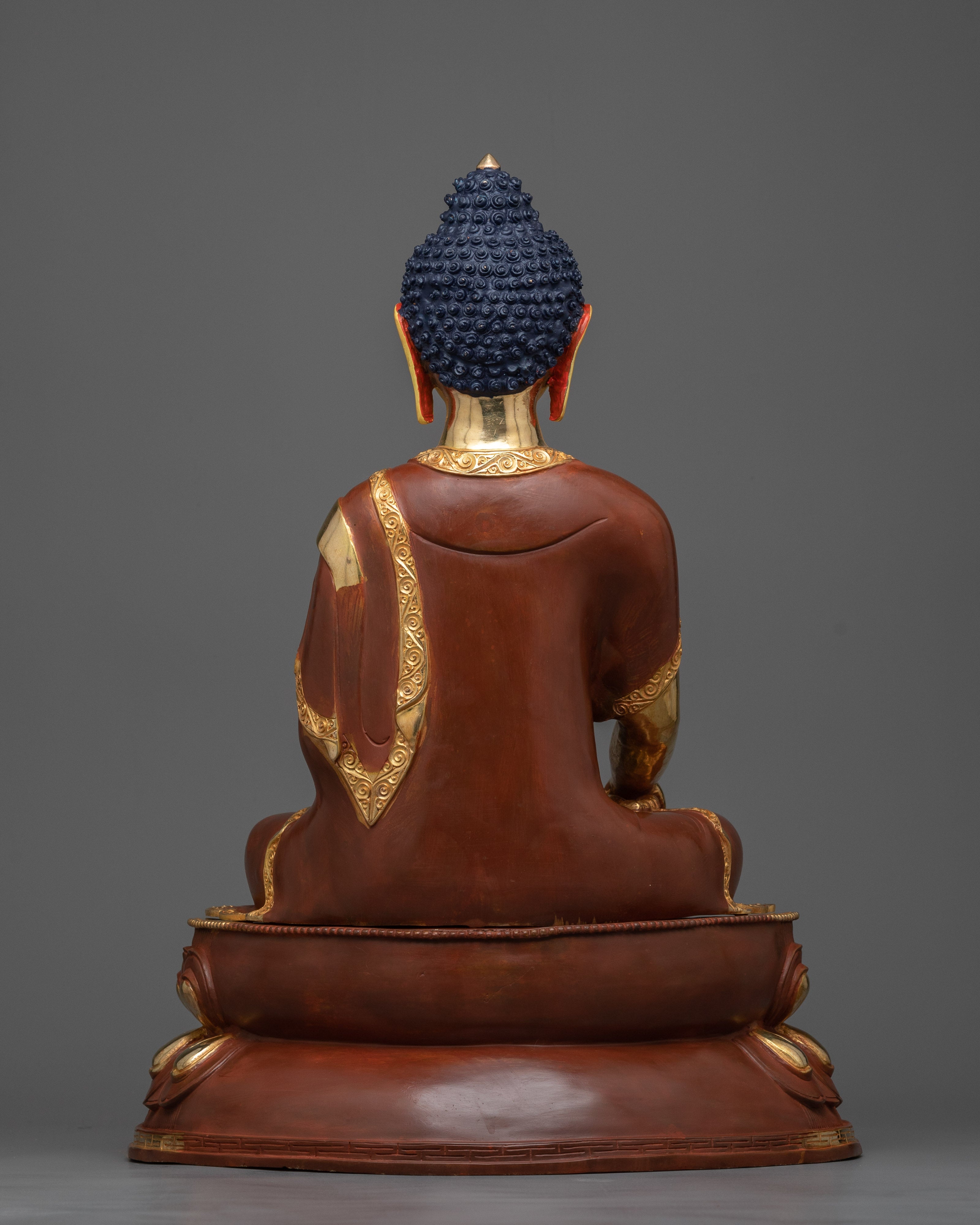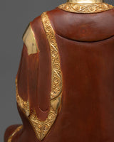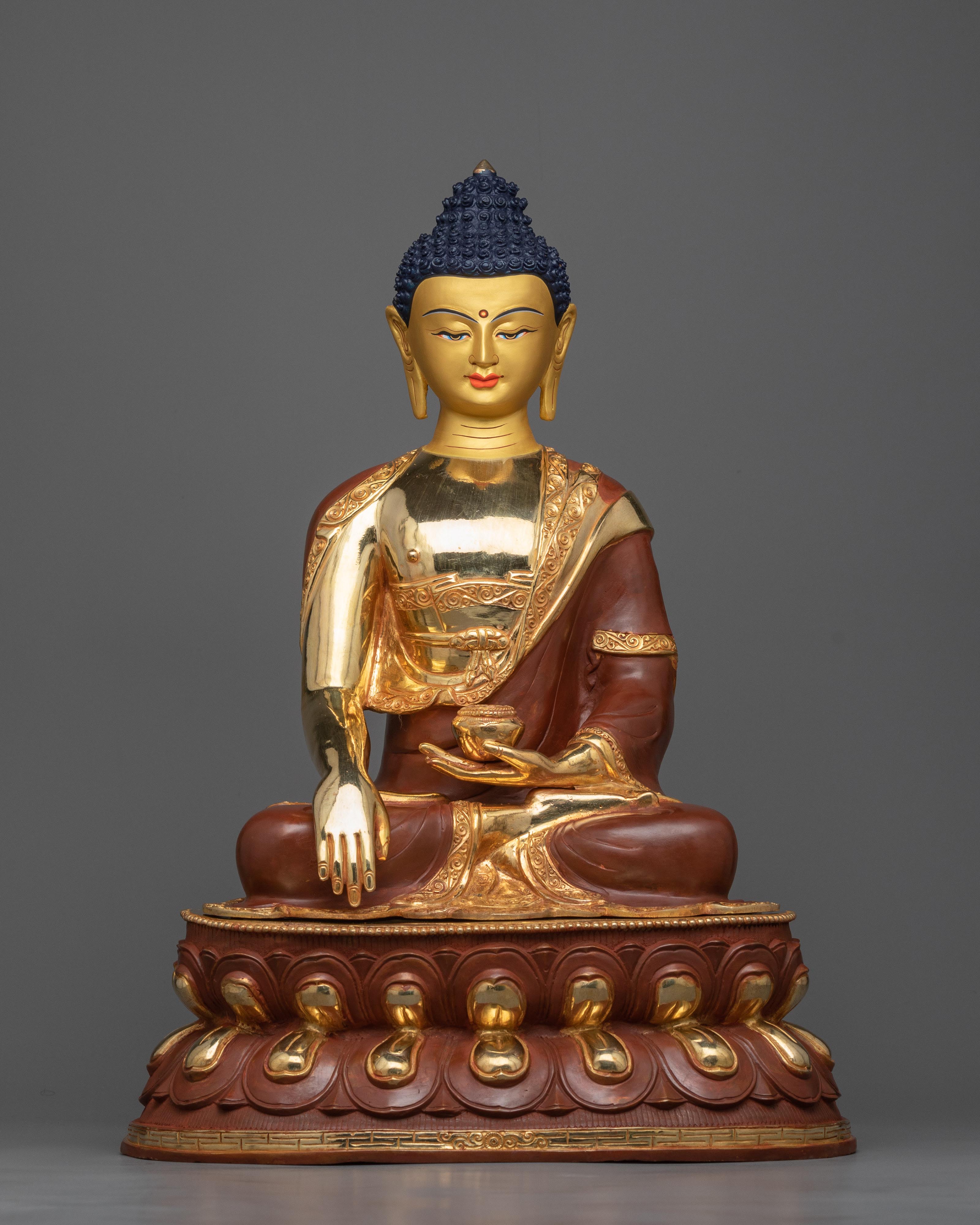 We are pleased to present the Shakyamuni Historical Buddha Sculpture, a magnificent portrayal of the Buddha himself, Siddhartha Gautama. After achieving enlightenment, Gautama became known as Shakyamuni, "the Sage of the Shakya clan." This sculpture, which stands an impressive 18.8 inches tall on a 14.1-inch base and weighs 9.79 kg, represents the Buddha's calm, profound knowledge, and infinite compassion. With its oxidized copper body that gives it a timeless and venerable aspect and its intricate gold and acrylic paintings and 24K gold plating, this item perfectly reflects the heavenly essence and spiritual purity of the historical Buddha.