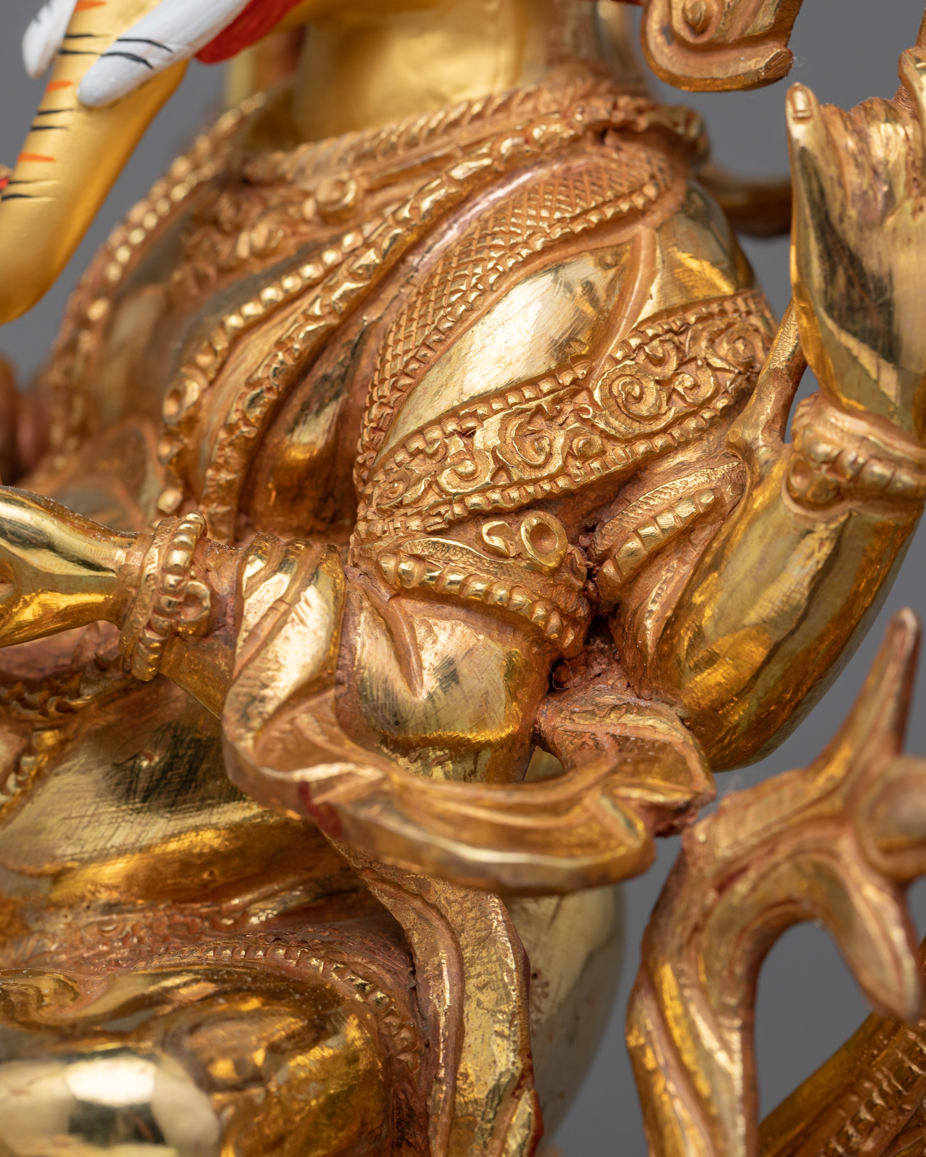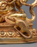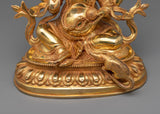 Accept the spiritual energy of the Shree Ganesha Statue, which is a symbol of wealth and blessings from God. With its graceful height of 11"/28cm and its strong base measuring 9.4"/24cm and weighing 3.58 kg, this work of art exudes a sense of grandeur and respect. The statue is incredibly detailed, with elaborate paintings in gold and acrylic, a copper body, and 24K gold gilding that represents divine prosperity and auspiciousness. Feel the transformational power of Lord Ganesha's blessings by inviting him into your home or altar.