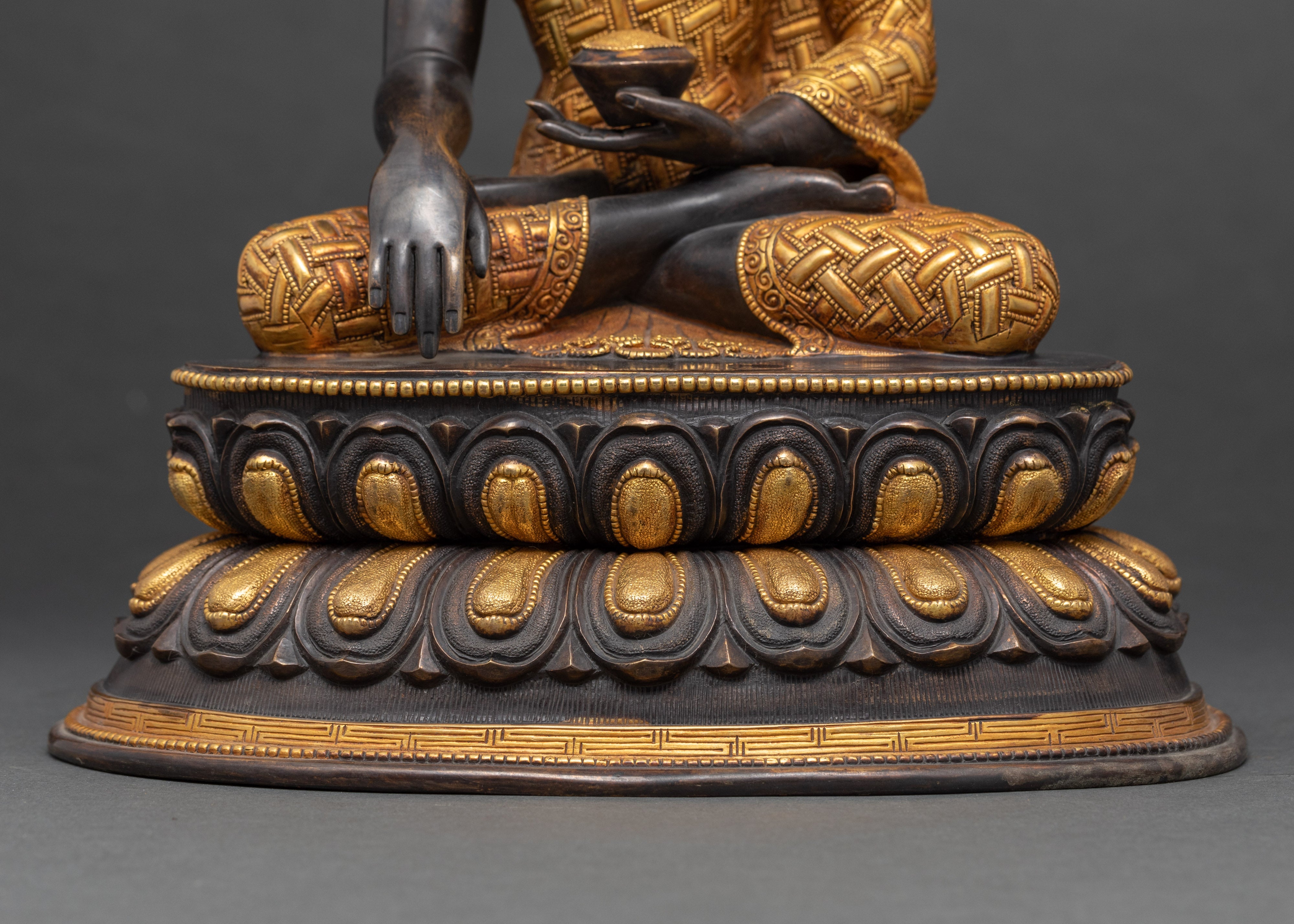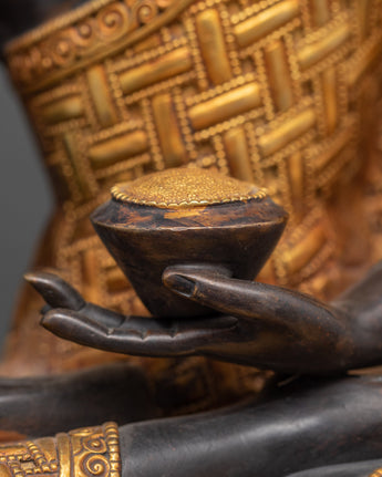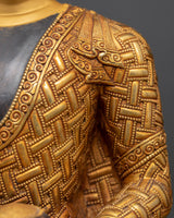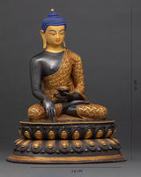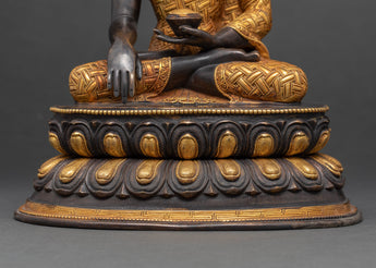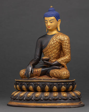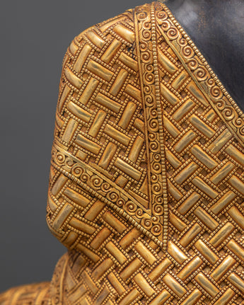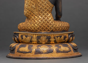 We have exquisitely hand-carved the sculpture of Siddhartha Guatama in the traditional Himalayan Art of Nepal. The deity is depicted seated on the lotus in a meditation posture, with his legs crossed at the ankles and the soles of his feet facing upward, and his back completely straight. He is adorned in a monk robe with an intricate design pattern with fine details that covers his left shoulder. The skillset to craft such figurines has been passed down for generations. It took months of hard work with complete devotion to mold the body using copper and gliding with 24K pure gold. The use of Acrylic painting makes this statue look outstanding. You can use this statue for different Buddhist Rituals as well as meditation and yoga.
