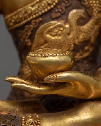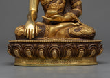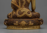 This seated Buddha Shakyamuni is a meditation statue crafted using the traditional method. The deity is seen sitting on the top of the moon disc lotus with a peaceful expression. The Ushnisha of buddha is painted with acrylic color. The different designs crafted on the monastic robe are featured with gold plating, whereas the other design is painted with acrylic color.