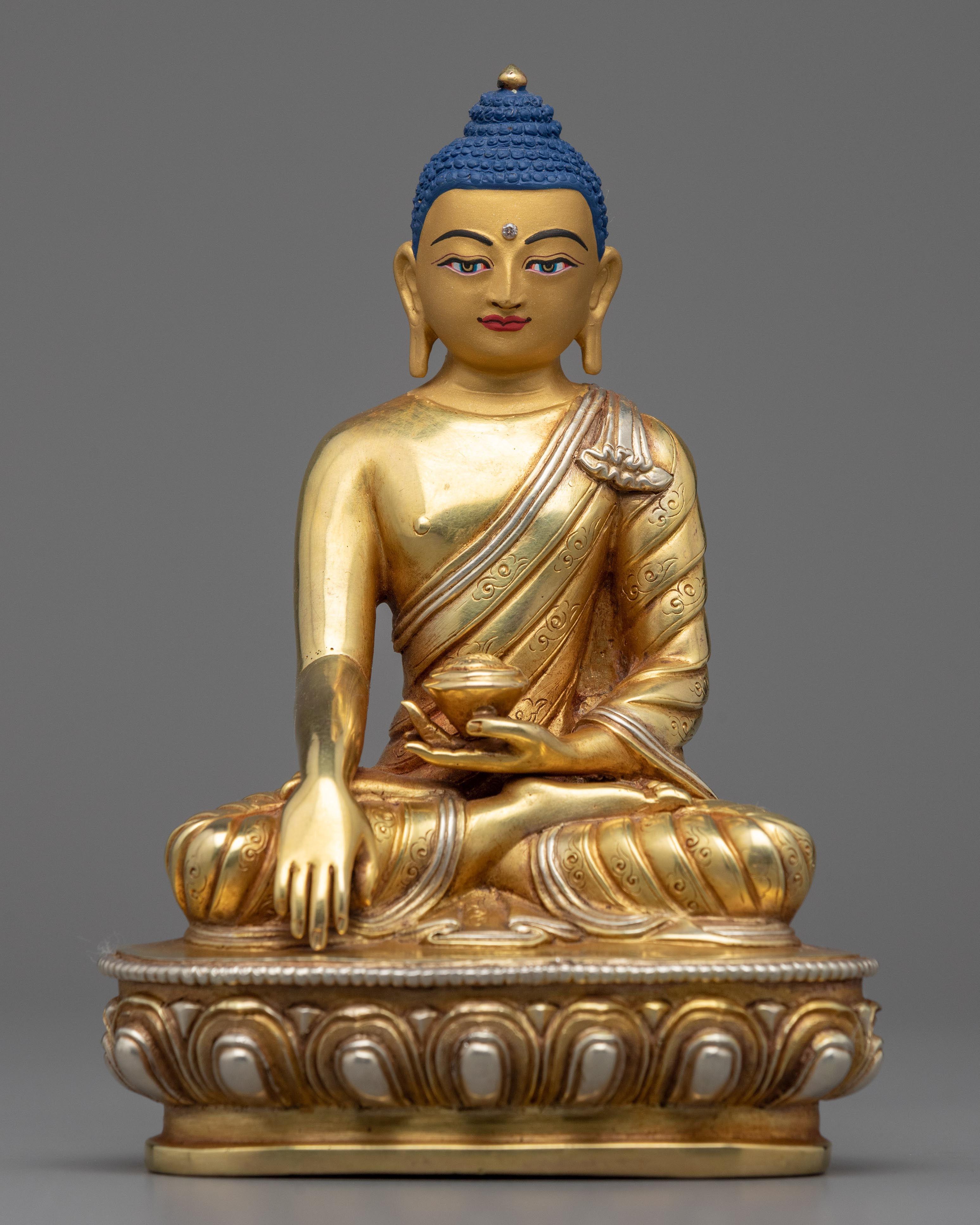 This beautifully crafted piece of Siddhartha Gautama buddha statue employs traditional Himalayan motifs and designs delicately produced in our studio. The copper body of the statue is gold gilded, which provides the statue with its luster. The Buddha is depicted seated on a moon disc lotus. He holds an alms bowl in his right hand while portraying the 'Bhumisparsa Mudra,’ representing the Buddha's awakening. Acrylic paints highlight the Buddha's sublime facial expression.