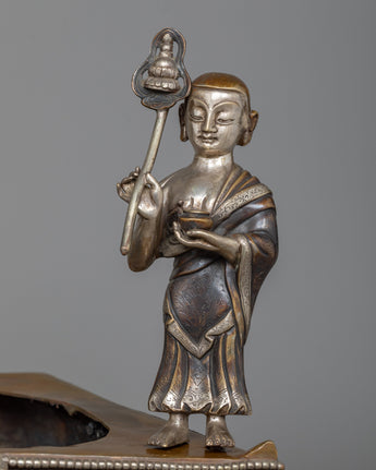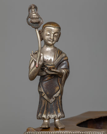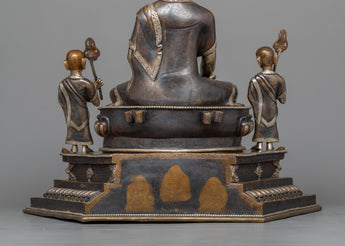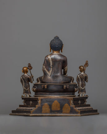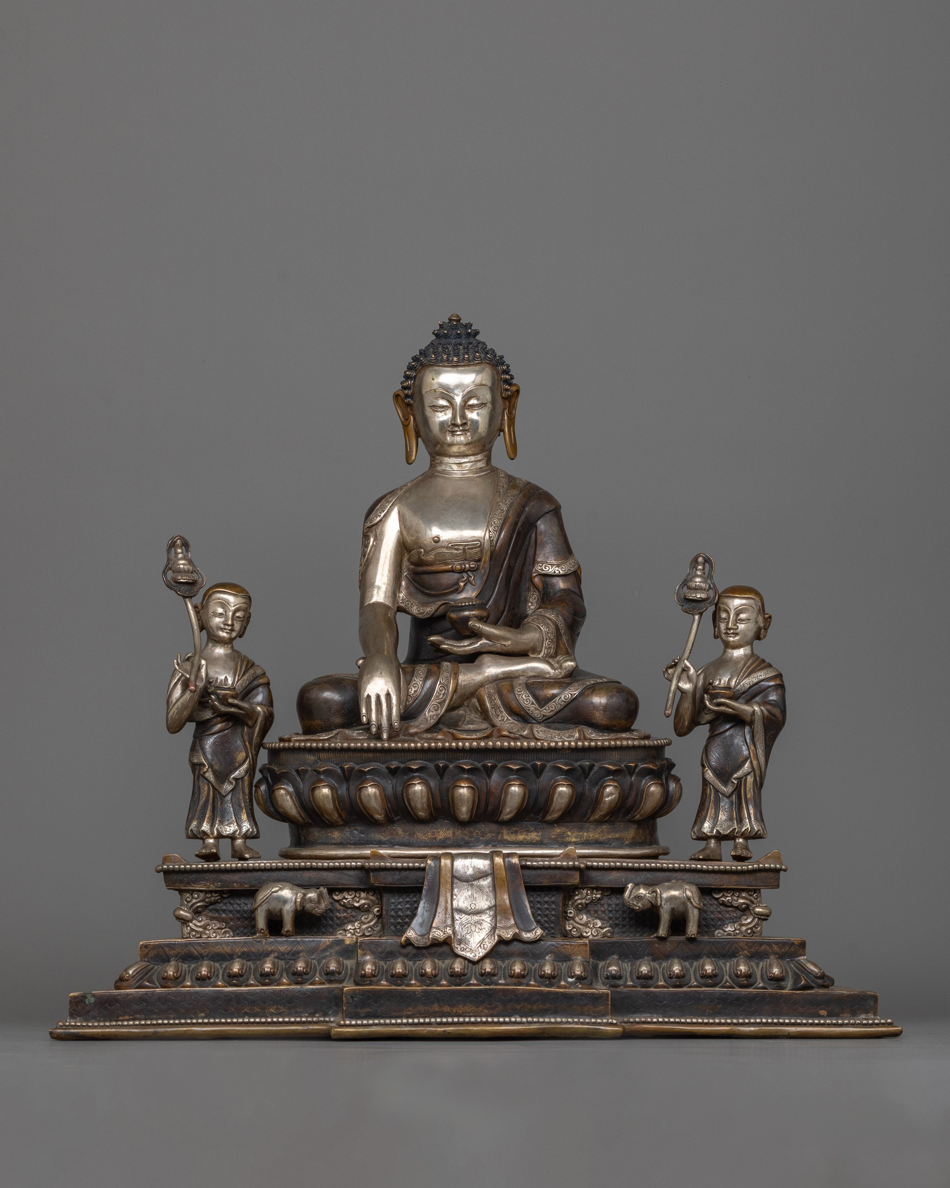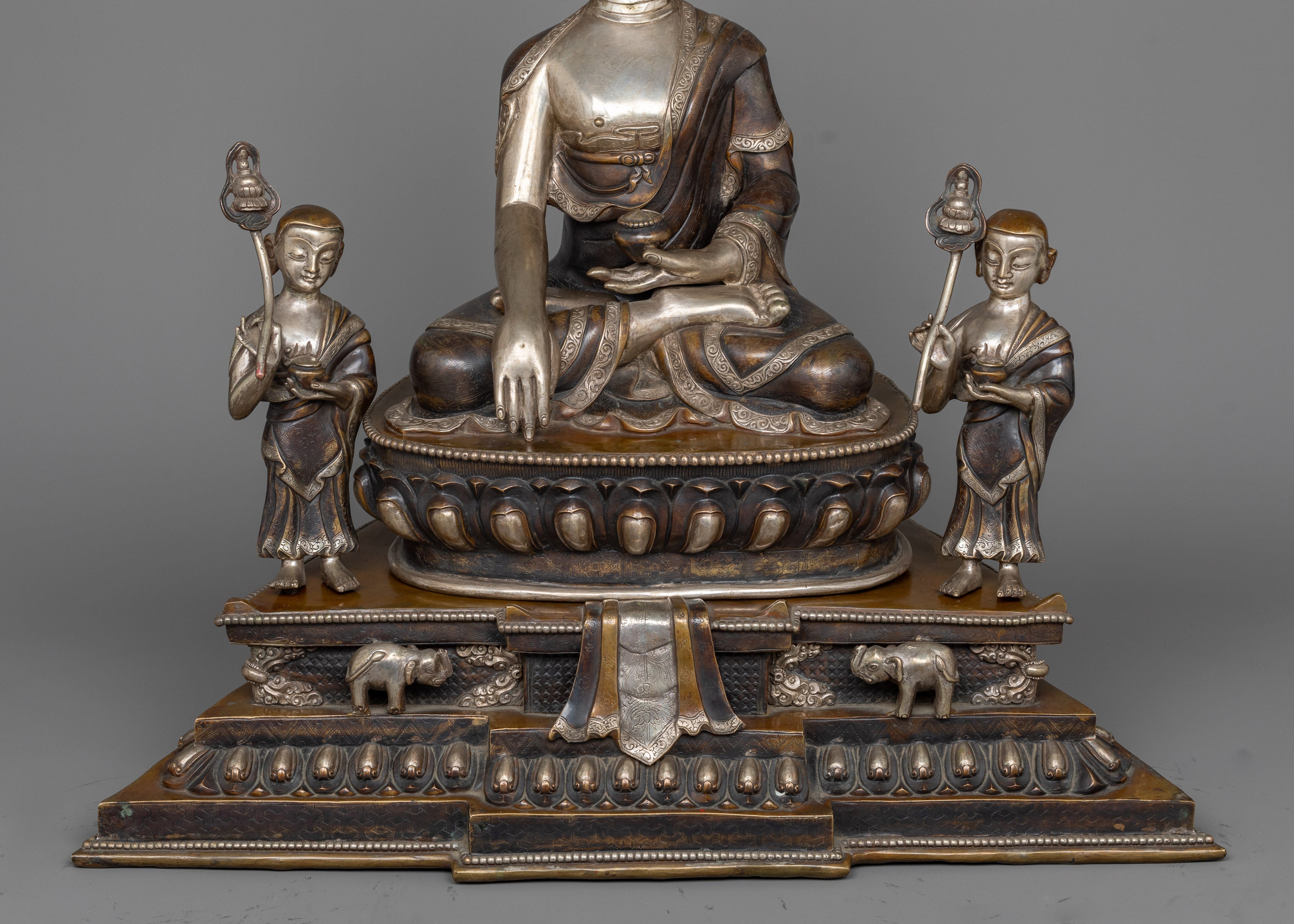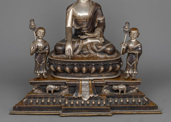 With our Enlightened-One Statue, a beautiful portrayal of the Buddha in his enlightenment with two of his leading disciples, you will feel a profound spiritual depth. This towering statue is precisely created with an oxidized copper body, gracefully accentuated with silver plating, and given an antique finish to symbolize the Buddha's timeless wisdom.