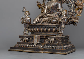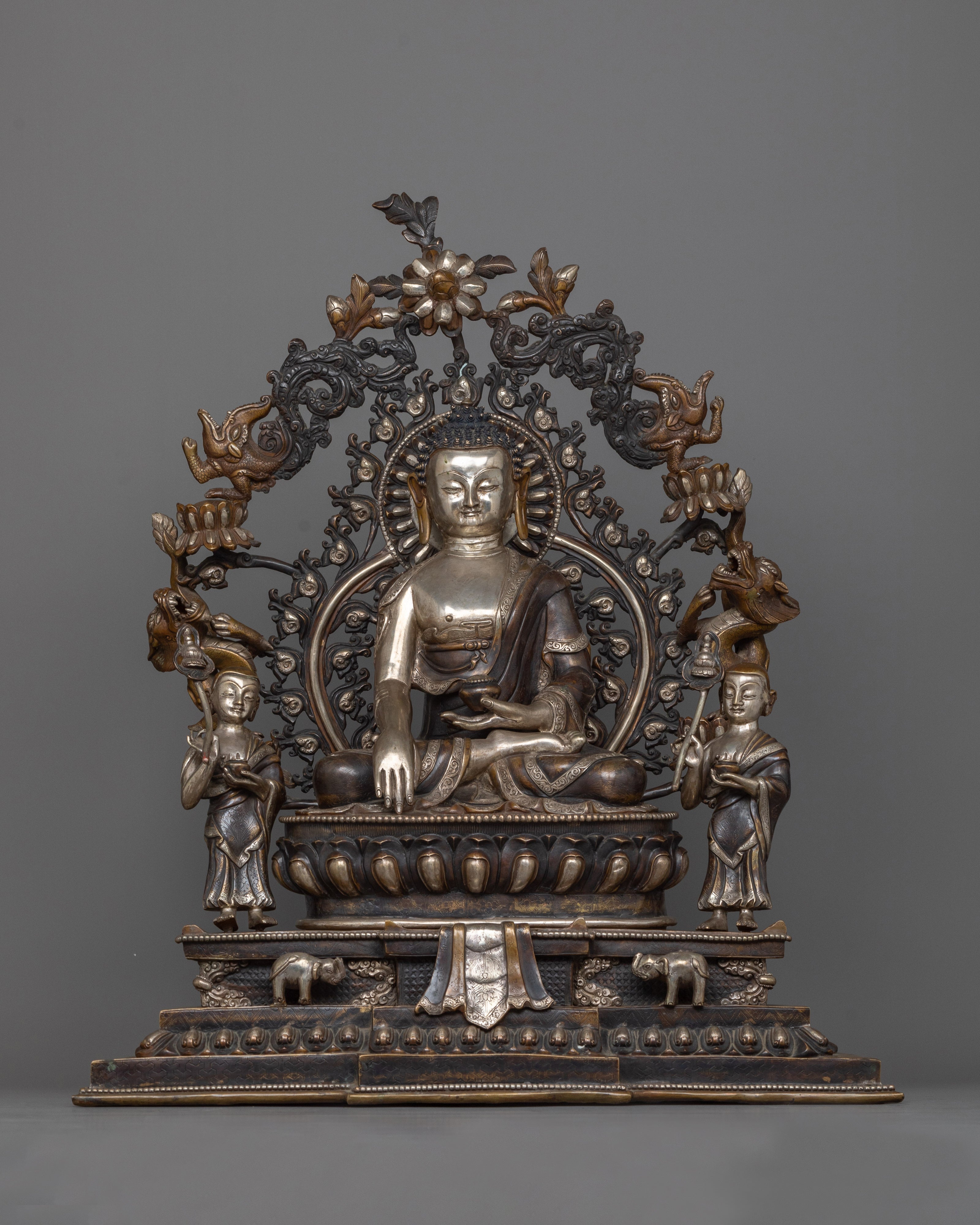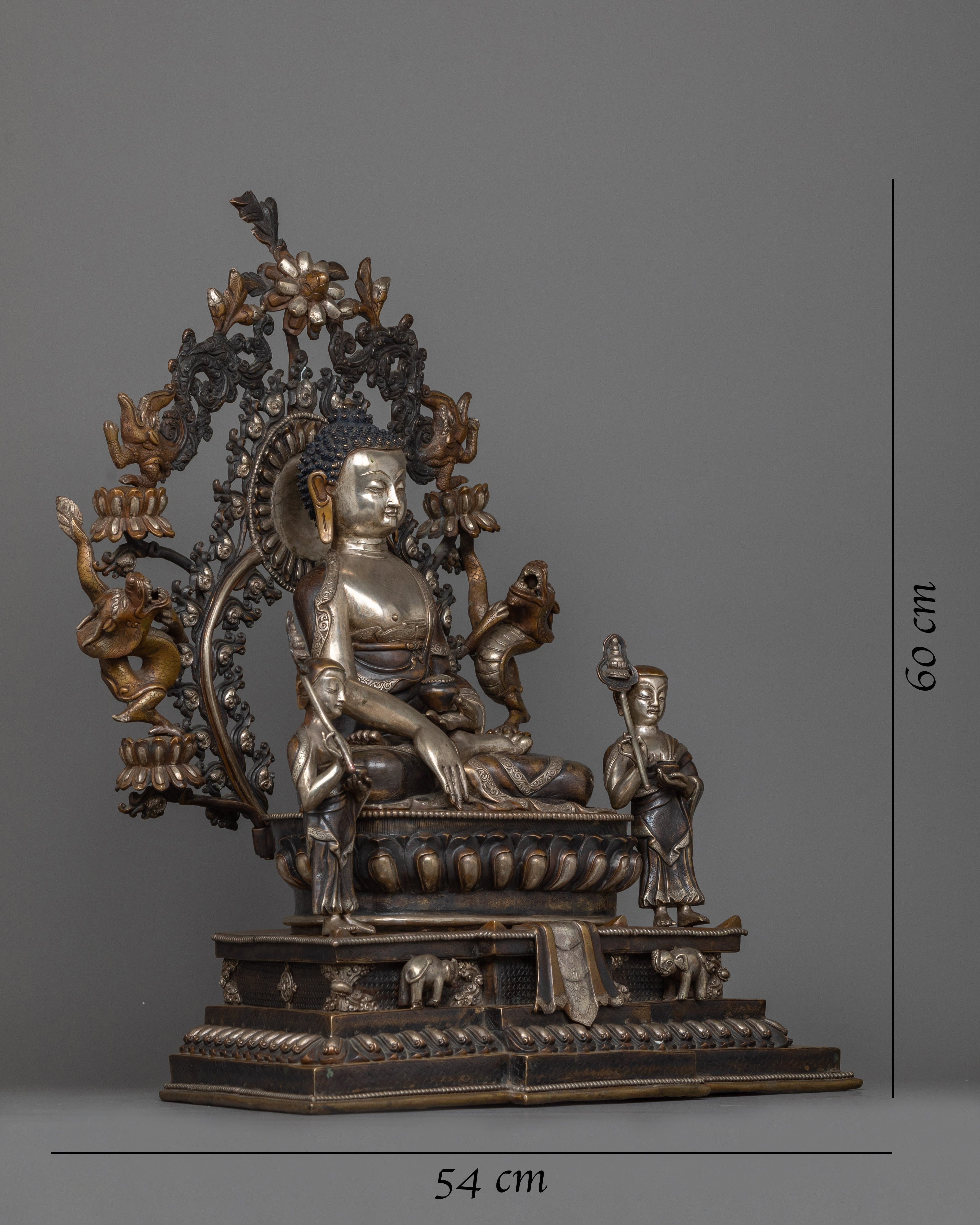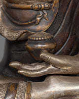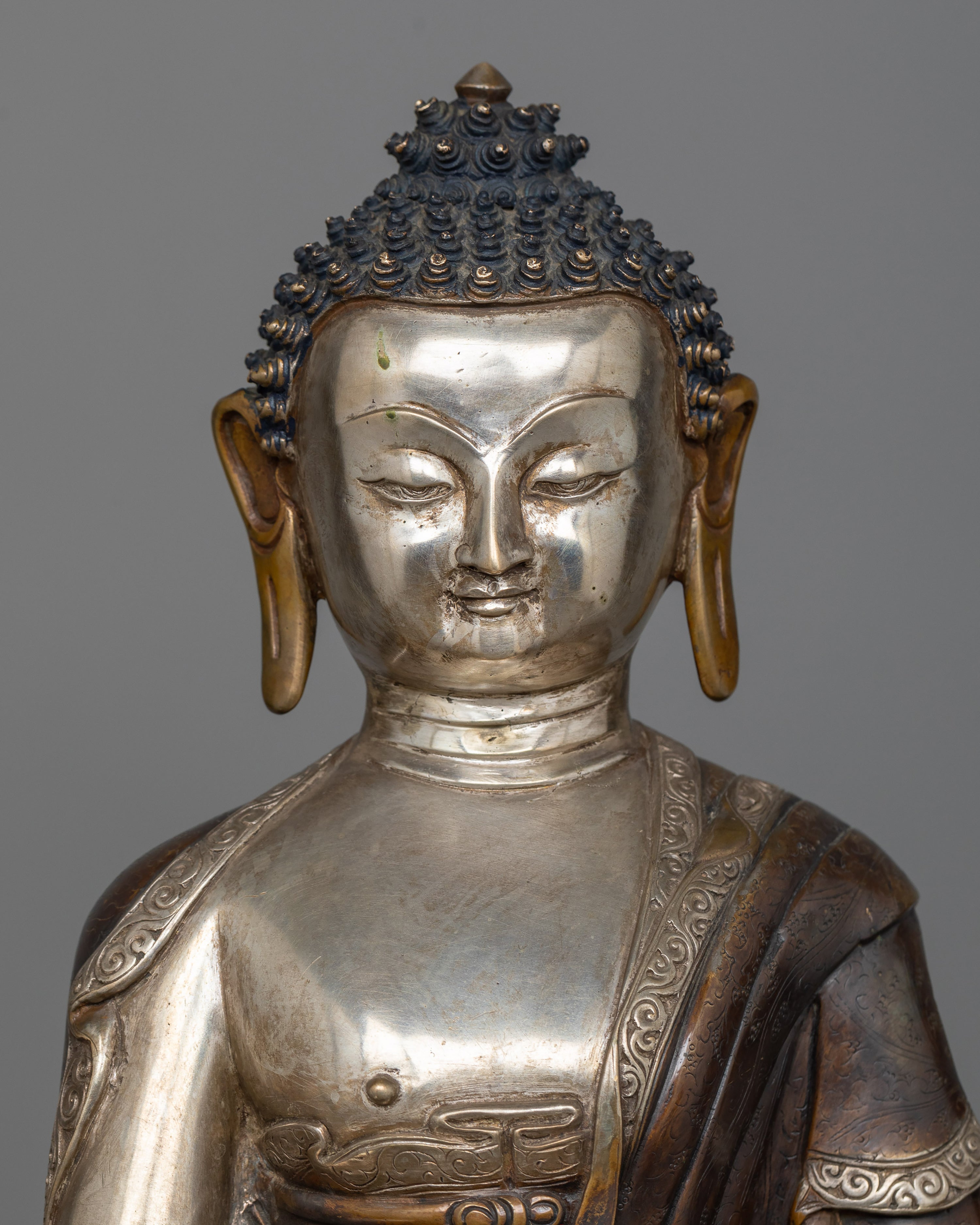 The silver coating on the oxidized copper body offers a bright brilliance while also representing the purity and clarity of enlightenment. The antique finish adds historical depth, reminding us of the Buddha's teachings' enduring impact. This big sculpture is ideal for providing a focal point in a meditation hall or spiritual center or as a noteworthy addition to a personal sacred art collection.