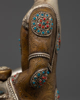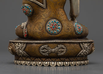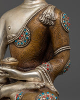 Silver Plated Shakyamuni Buddha Statue, is a magnificent handcrafted sculpture that exudes tranquility and enlightenment. This statue, created in the heart of Patan, Nepal, boasts a precisely carved oxidized copper body that has been delicately silver plated, resulting in a harmonic marriage of modern and traditional creativity. The acrylic painting has vibrant details to enhance the Buddha's spiritual presence.