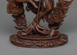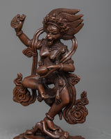 This magnificent Oxidized Copper Sculpture depicts the Simhamukha Dakini's profound spiritual protection and knowledge. This artwork, measuring 7.8 inches and weighing 0.89 kg, embodies the essence of Simhamukha, the lion-faced dakini famous for her ability to overcome obstacles and bad energies. Crafted from oxidized copper, the sculpture has a rich, textured finish that emphasizes Simhamukha's strong and imposing presence.