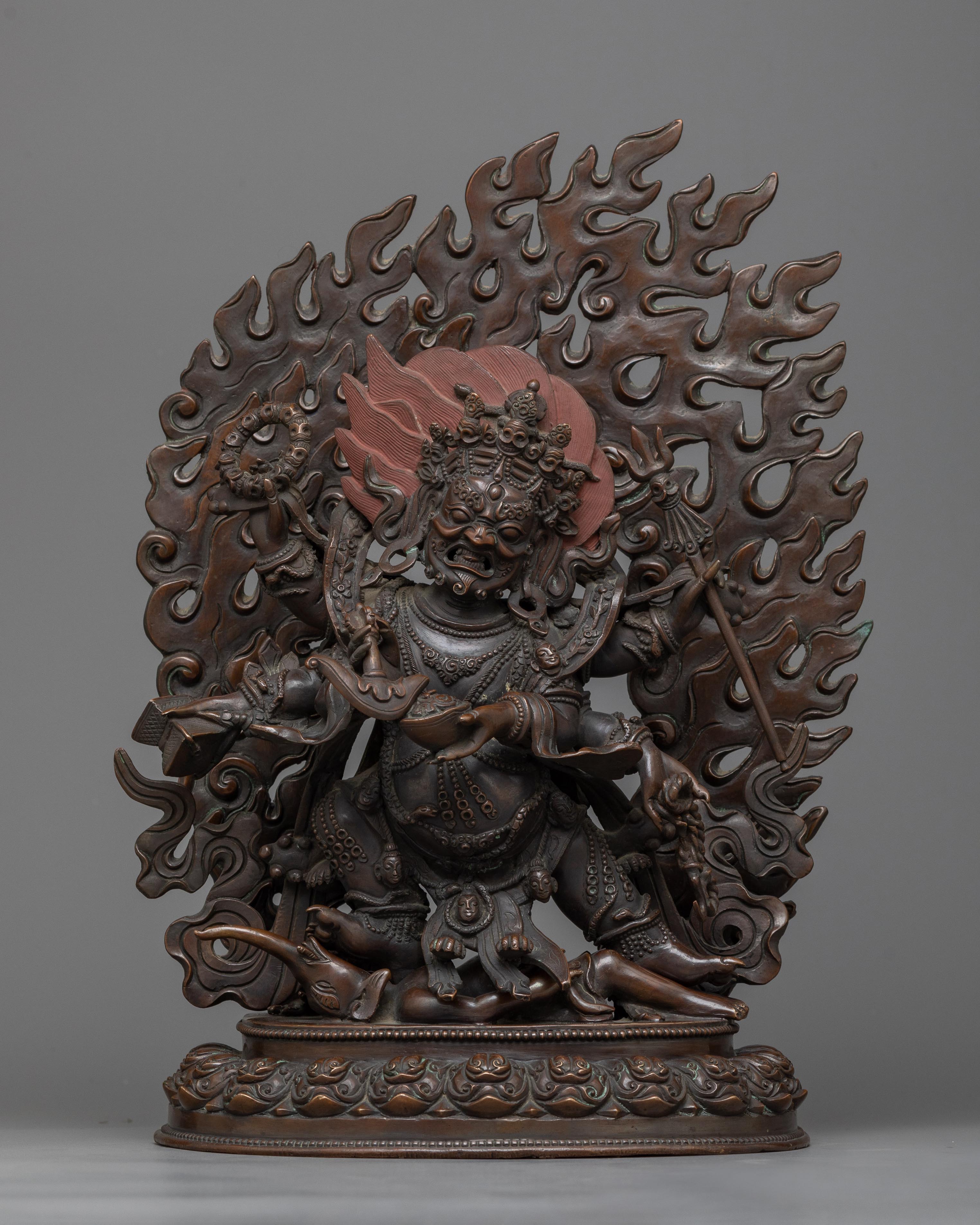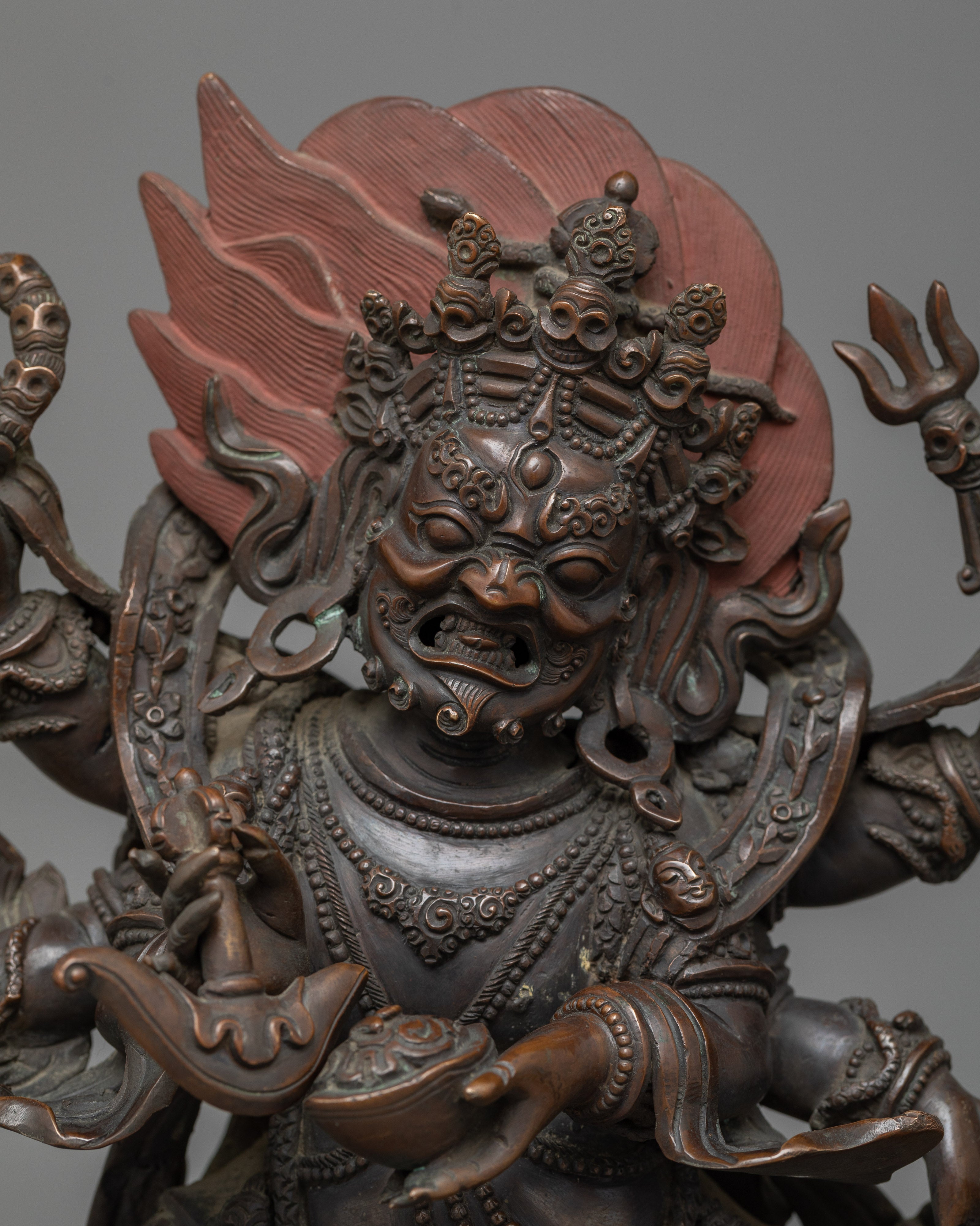 Introducing the Six-Armed Mahakala Chocolate Oxidized Statue, a powerful portrayal of Tibetan Buddhism's venerated protector deity. At 12.9 inches tall, this statue represents Mahakala's powerful energy and unyielding commitment to protecting the Dharma. This oxidized copper body statue, weighing 5.30 kg, is a hefty artwork suitable for anyone seeking the ferocious protection and spiritual strength Mahakala provides.