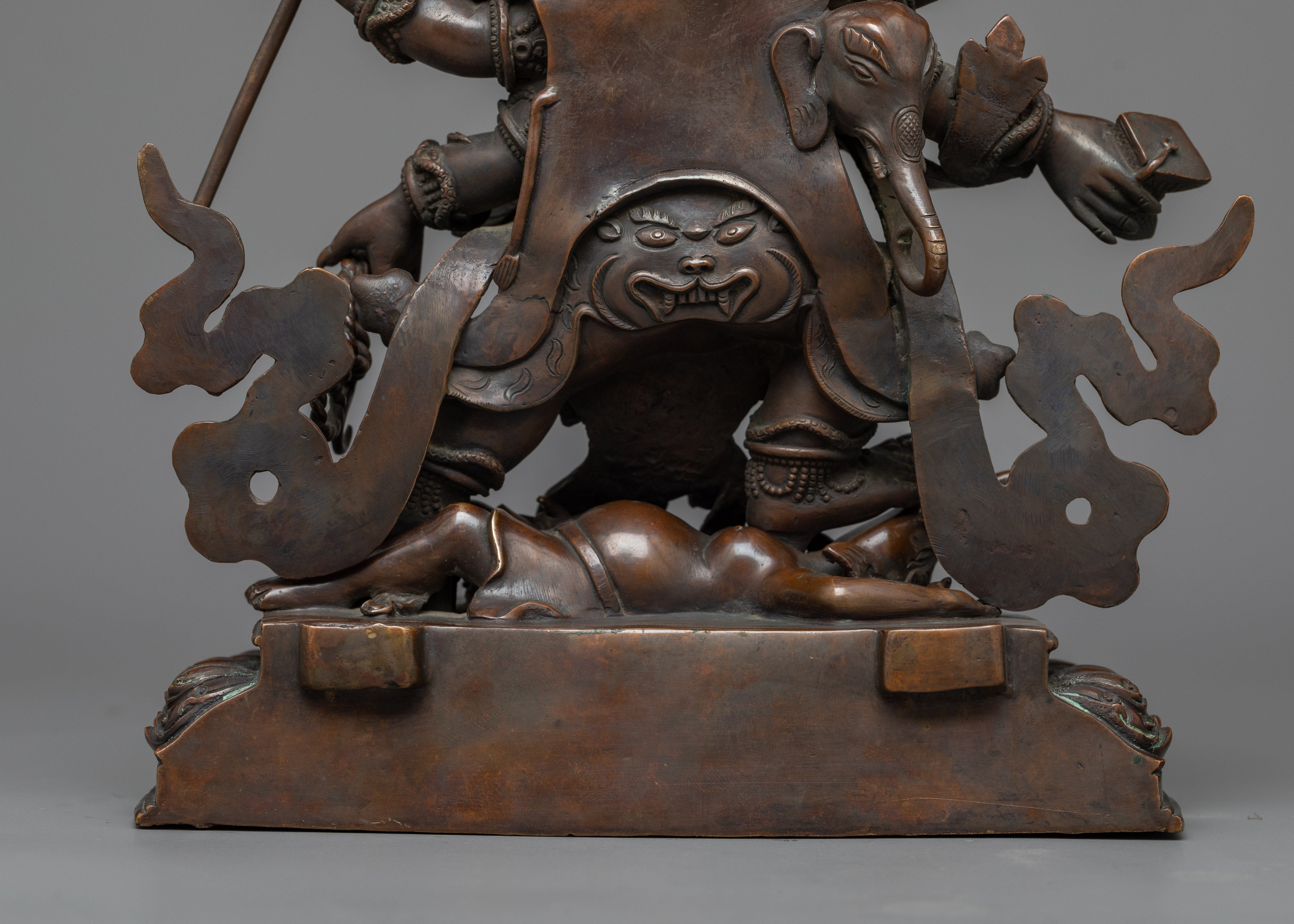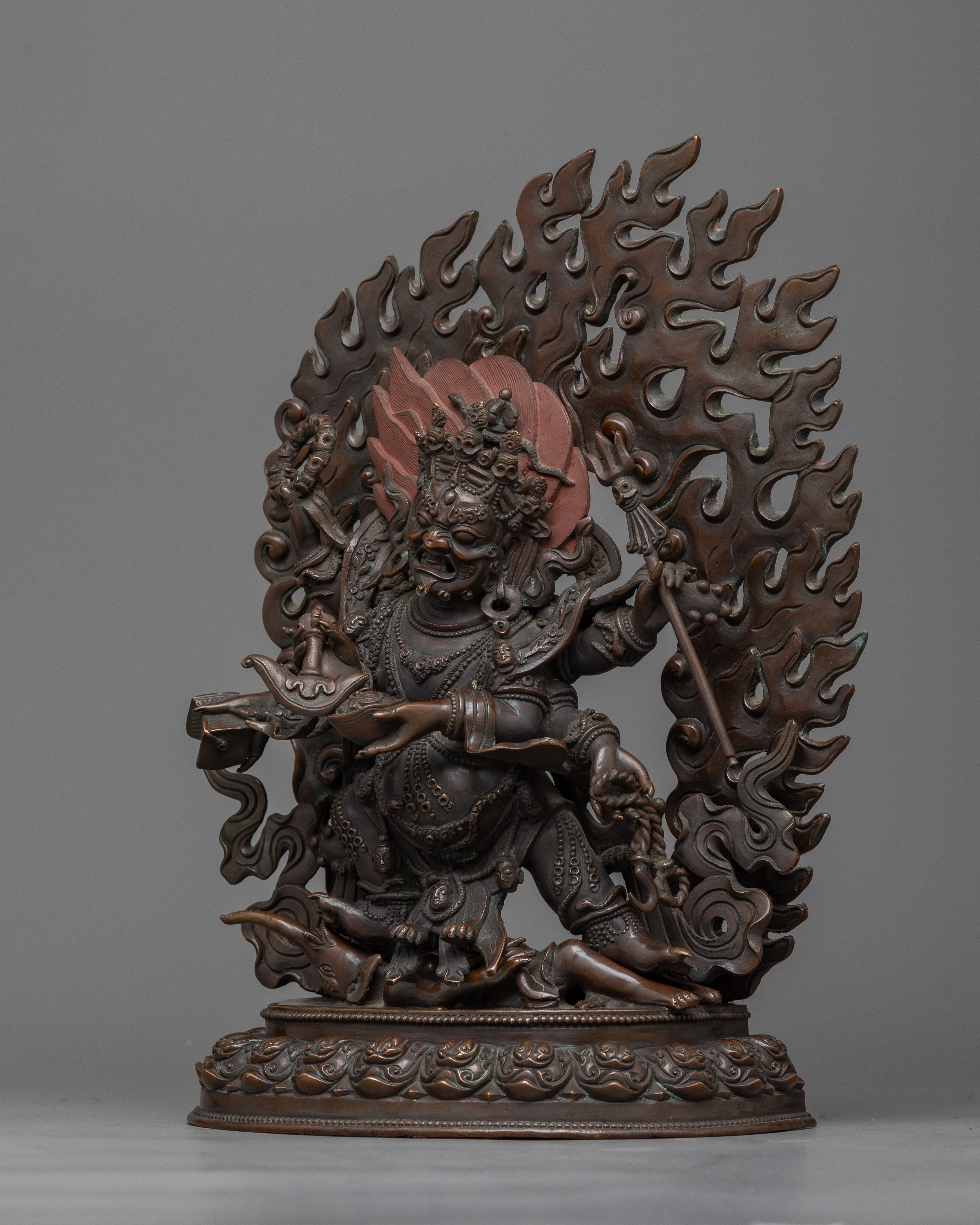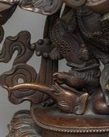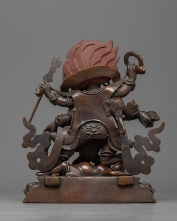 The rich, dark patina created by the chocolate oxidation technique gives this statue a powerful presence, reminiscent of old bronzes but endowed with ageless energy. It is an awe-inspiring addition to any practice space, altar, or sacred art collection, symbolizing the deity's duty as a protector against bad influences and difficulties on the path to enlightenment.
