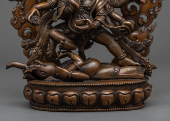 Handcrafted from a copper alloy by master artisans of Nepal whose skills have been passed down to us for generations. Mahakala has three eyes that represent the past, present, and future, as well as a strong understanding of time. He is depicted with a wrathful expression, standing/stomping on an elephant beneath him.