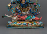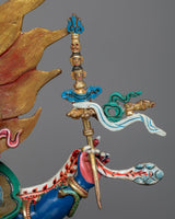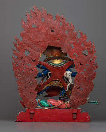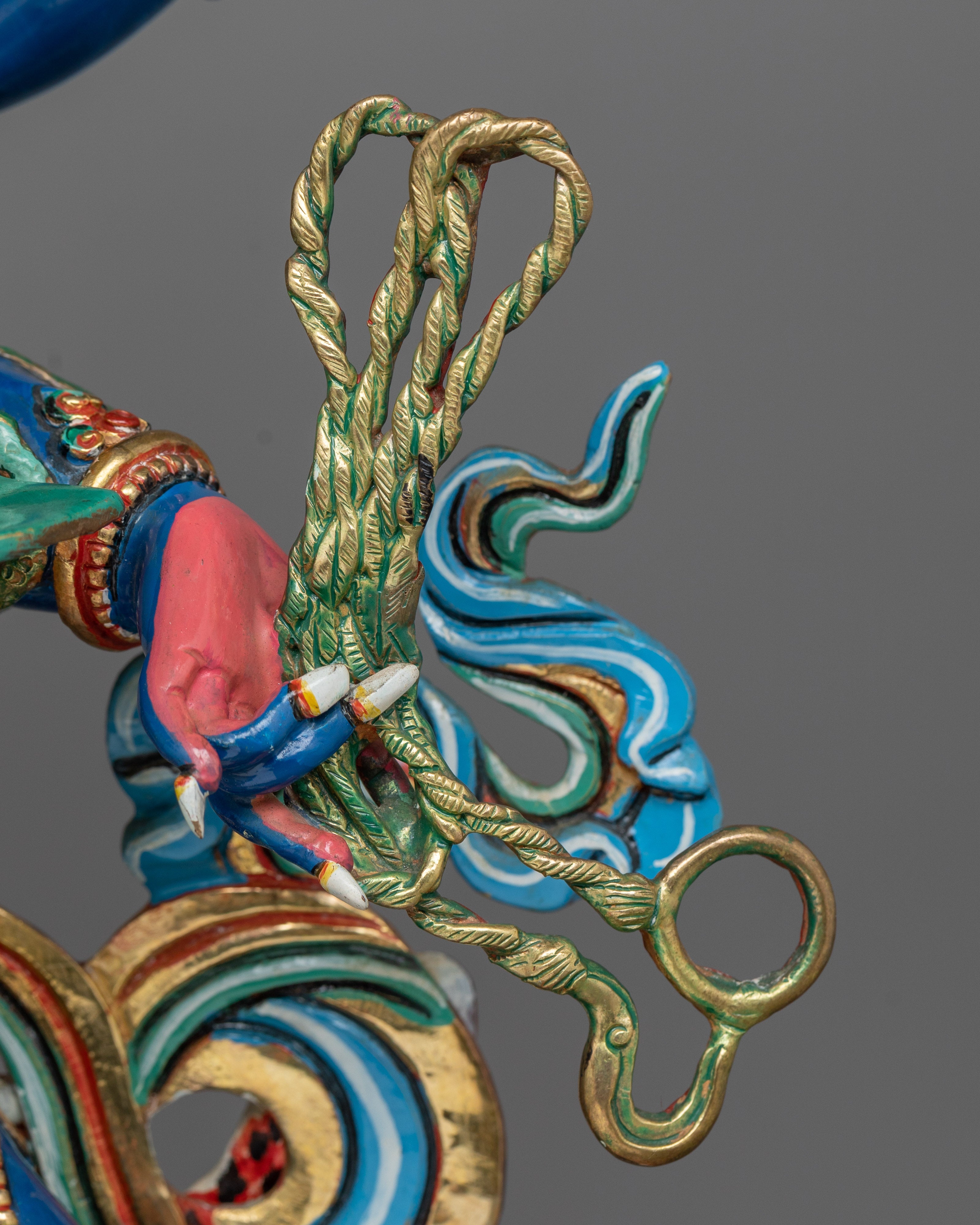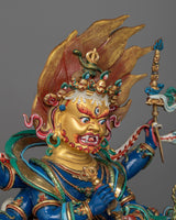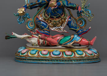 This statue's rich, deep color palette stands out, with specific care delivered to the customary blue of Mahakala's body, a hallmark of his iconic portrayal. The figure is gilded in 24K gold, which contrasts well with the deep blue and highlights the delicate features of his expression and clothes. The gold and acrylic paintings on the robust copper body accentuate each aspect of his formidable form, from the dynamic posture to the symbolic attributes he holds.