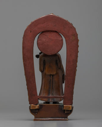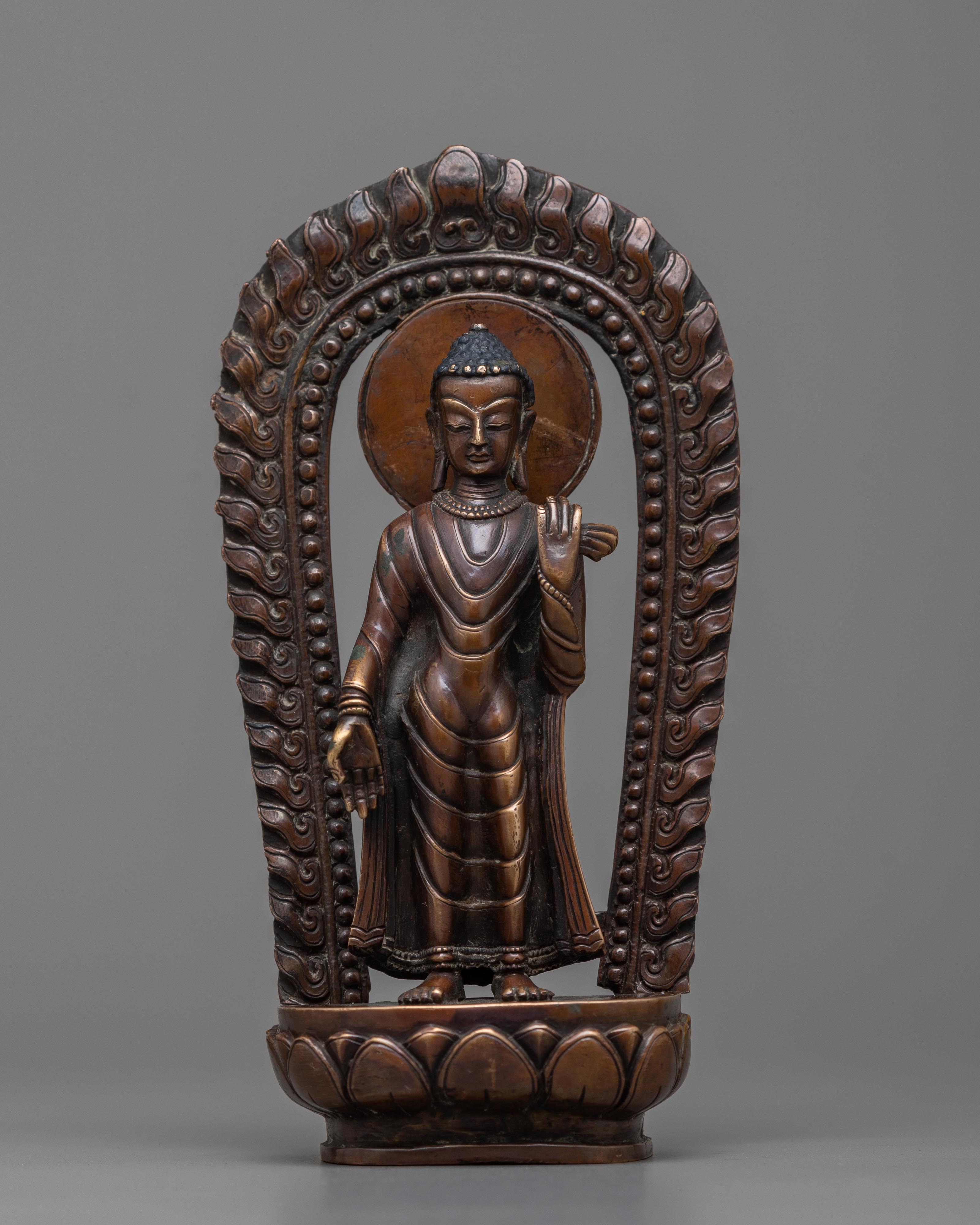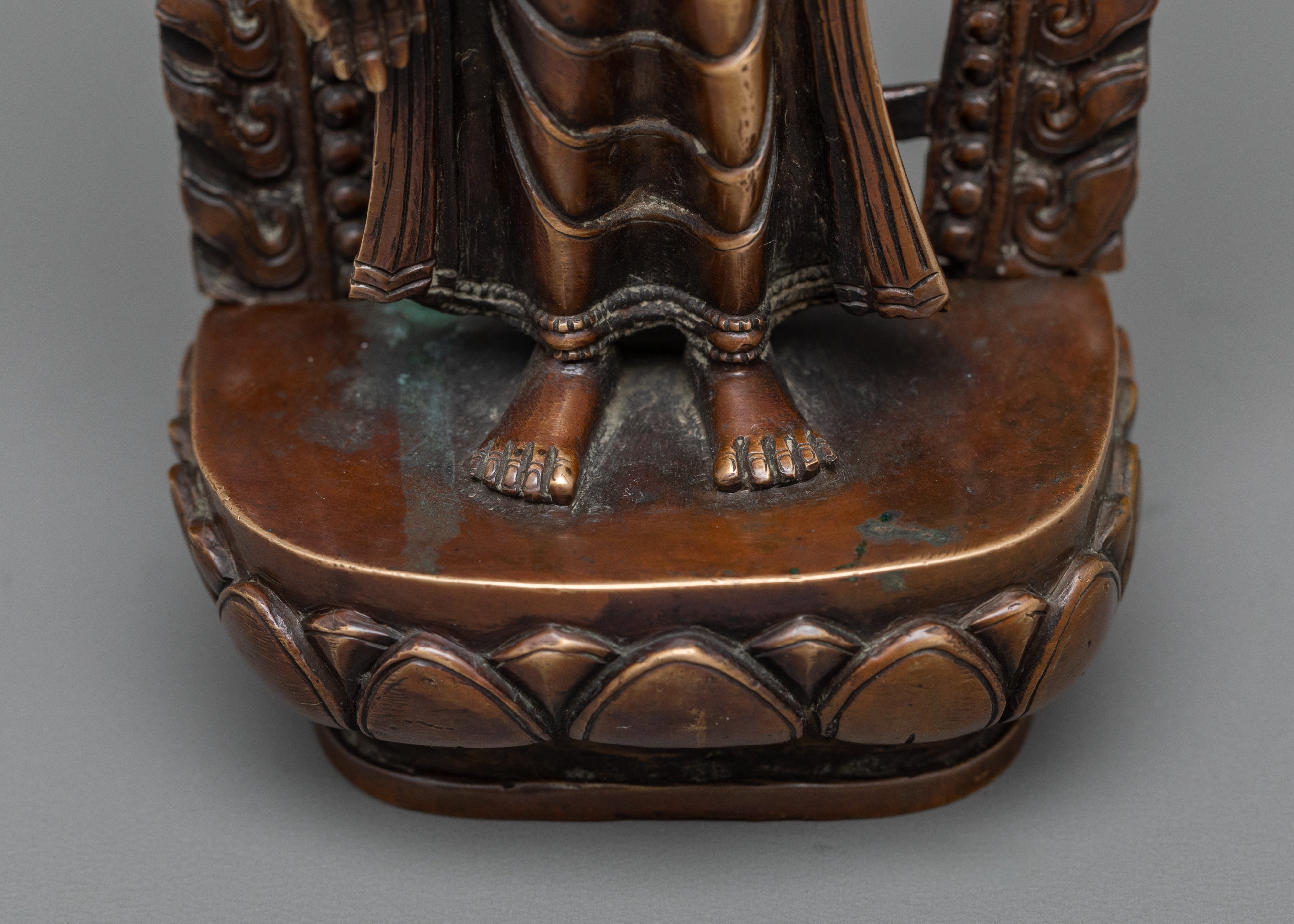 The Buddha is depicted standing on a lotus seat and has a beautifully hand-carved halo behind him. He is adorned with a fine handcrafted monk robe. The statue is only 6.2 inches tall and weighs 0.59 kg. The statue is made of an Oxidized Copper Body.