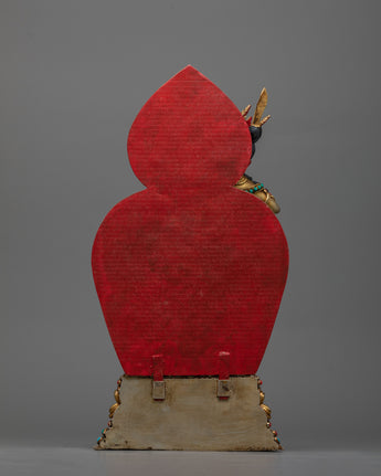 The Standing Manjushri statue will add radiance to your sacred place. This sculpture shows the bodhisattva of wisdom in a dance-like tilt, signifying the dynamic nature of knowledge and enlightenment. Manjushri stands as a beacon of immeasurable wisdom, with a halo shimmering behind him and poised upon a double lotus base.
