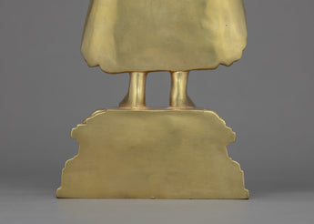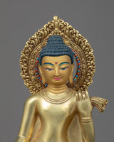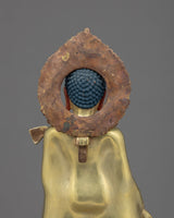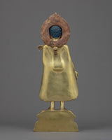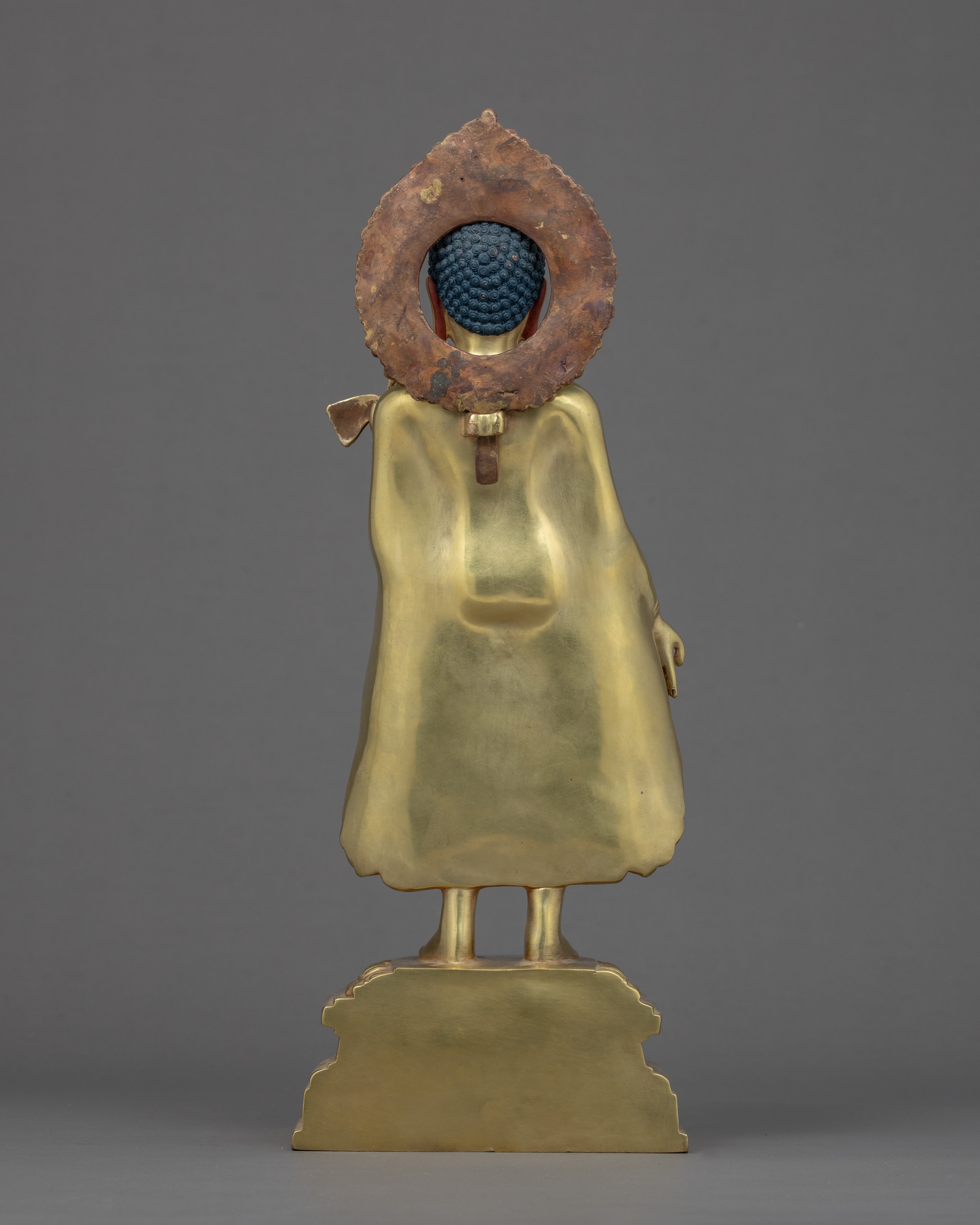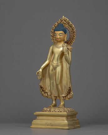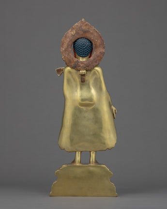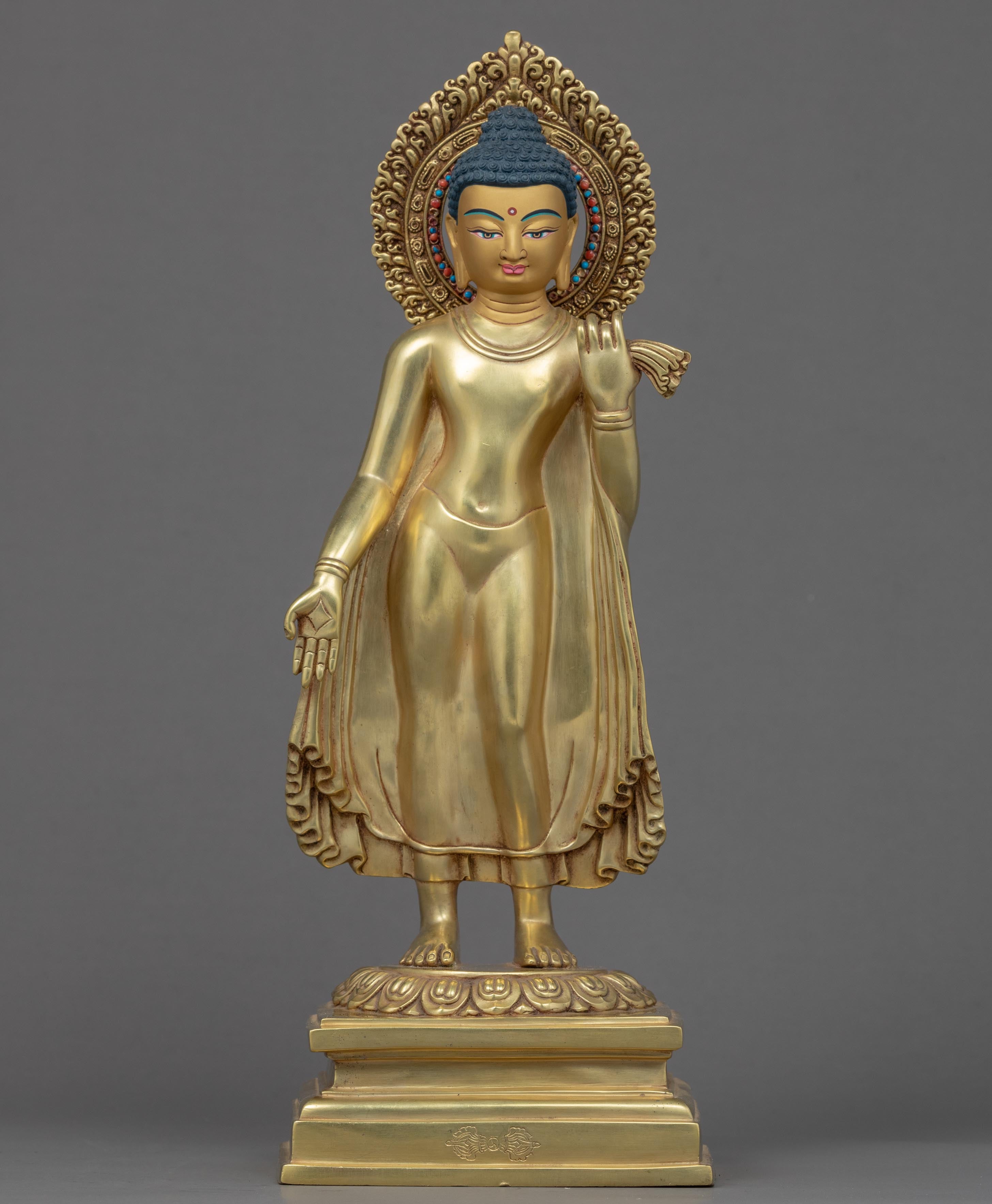 We are the Kathmandu Valley artists who sculpted the exquisite Standing Shakyamuni Buddha statue in pure copper and gilded it with 24 karat gold. Our craftsman has passed for generations, and we create ancient Vajrayana sculptures that portray Buddhism in a traditional Himalayan form. The exquisite halo, meticulously designed and made with valuable turquoise and embellishments, is mesmerizing. We portrayed Buddha with a peaceful expression, standing on a moon disc lotus seat. You can use the statue for regular meditation, yoga, and even in a different Buddhist ceremony.