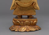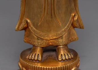 We have exquisitely hand-sculpted the Standing Buddha Shakyamuni Statue in a traditional Himalayan style made in Nepal. We have depicted the deity standing above a moon disc lotus. Standing with a peaceful expression, the left hand of the deity is pointed downward while his right hand is in the gesture of giving a blessing. The statue was carved using a copper body and then gilded with 24k genuine gold. This statue took our artists months of hard work to design the intricate patterns and details. You can use this figurine for different Buddhist Rituals and meditational practices.