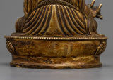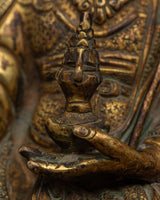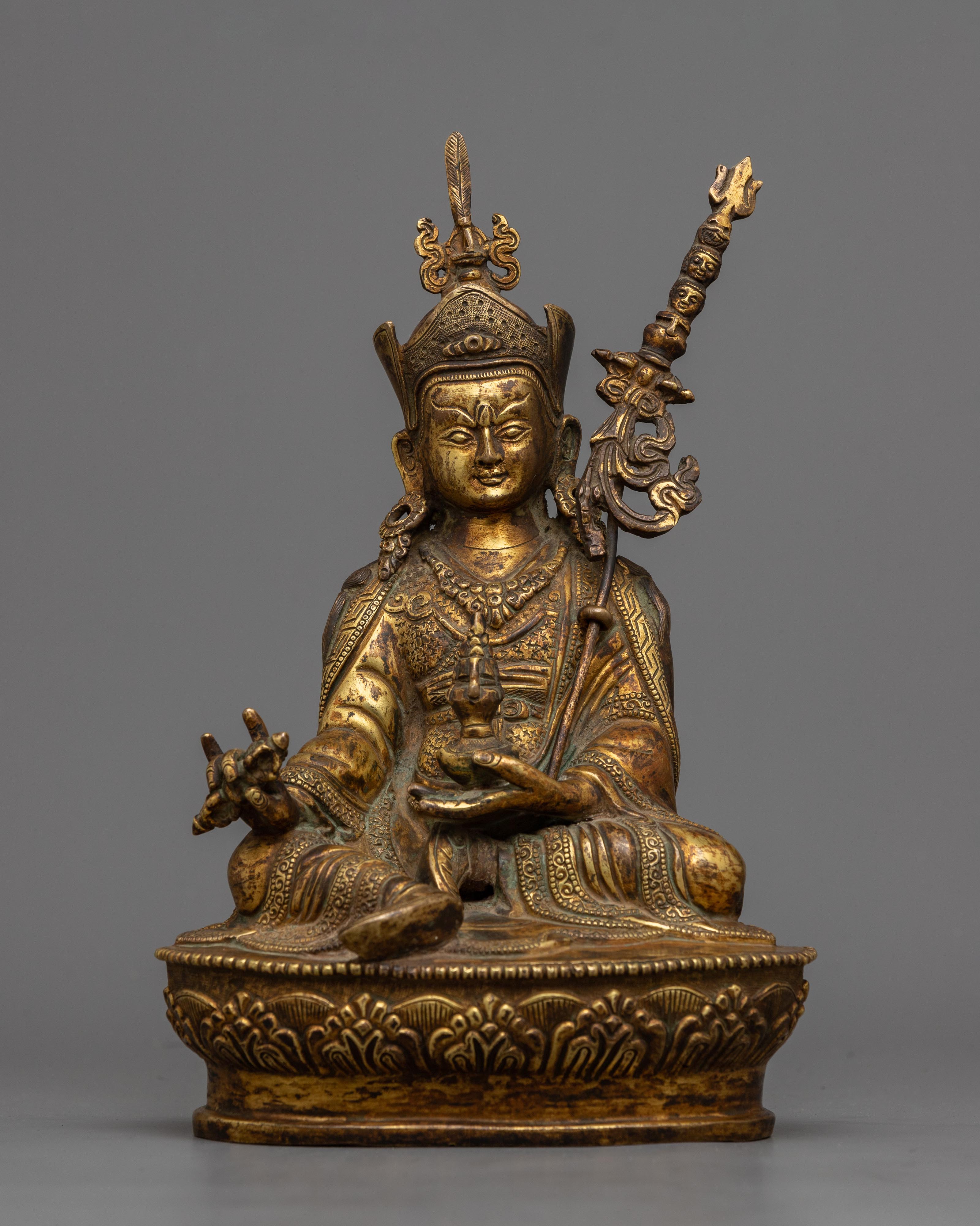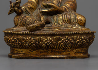 Admire the meticulous attention to detail that has gone into creating this masterpiece, a symphony of age-old traditions and modern refinement. The antique finish not only gives a time-honored elegance but also reflects a rich past, indicating a piece that, like Guru Rinpoche, has seen eras of transformation. Adorned with 24k gold gilding, the statue radiates a golden glow, symbolizing the luminous wisdom of Guru Rinpoche that continues to illuminate the paths of countless spiritual seekers.