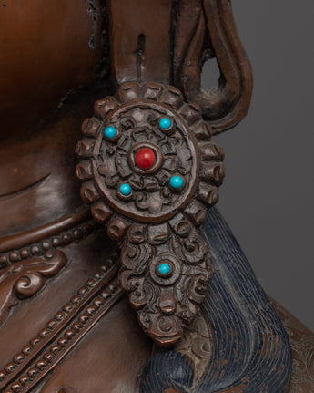 The statue of Chenrezig Avalokiteshrava has been traditionally hand-carved in an oxidized copper body. We are Kathmandu Valley artists whose craft has been passed down from generation to generation, reflecting Buddhism. This Buddhist statue can be used in a variety of rituals or ceremonies, as well as for indoor home décor. We depicted a deity with a peaceful expression on top of a moon disc lotus seat in this statue. In his upper-right hand, he holds a crystal rosary, and in his upper-left hand, he holds a lotus. In his lower hands is a wish-fulfilling jewel.