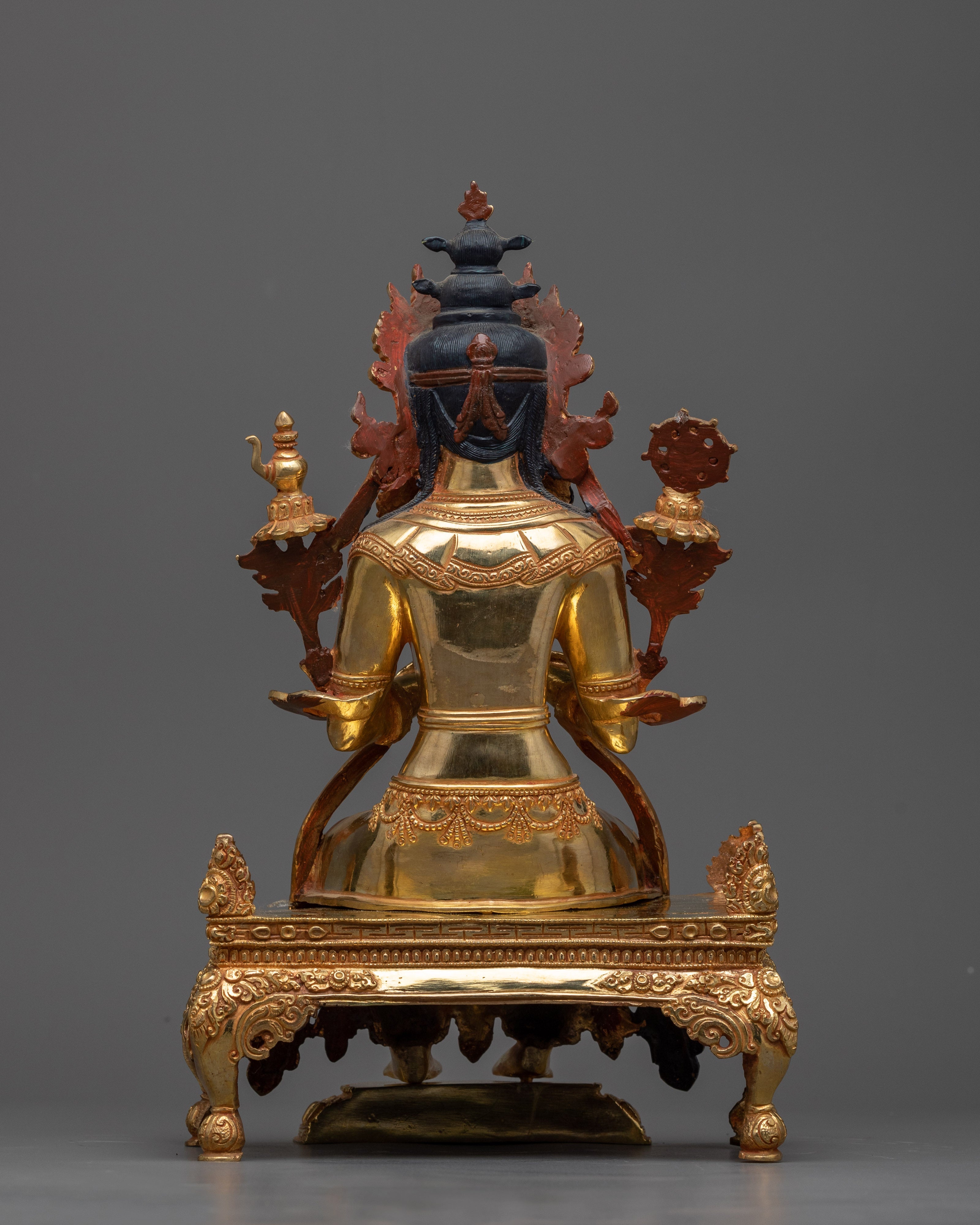 This statue, handcrafted with precision, exemplifies Nepalese craftsmanship, merging passionate narratives of Buddhist teachings with the careful details seen in 24k gold plating and brilliant acrylic paintings. The copper body is a monument to enduring spirituality, signifying a generational history of workmanship.