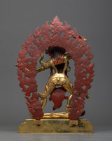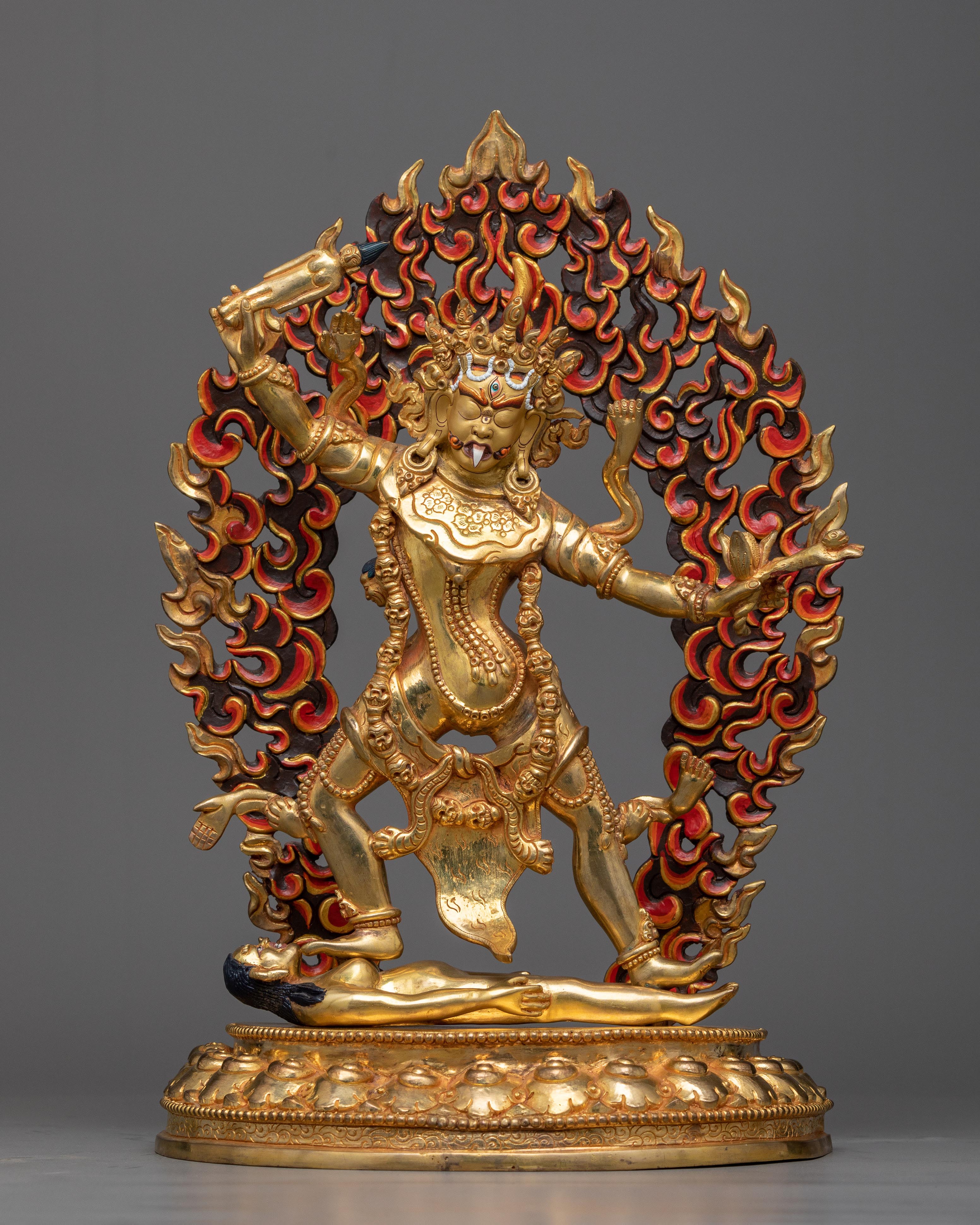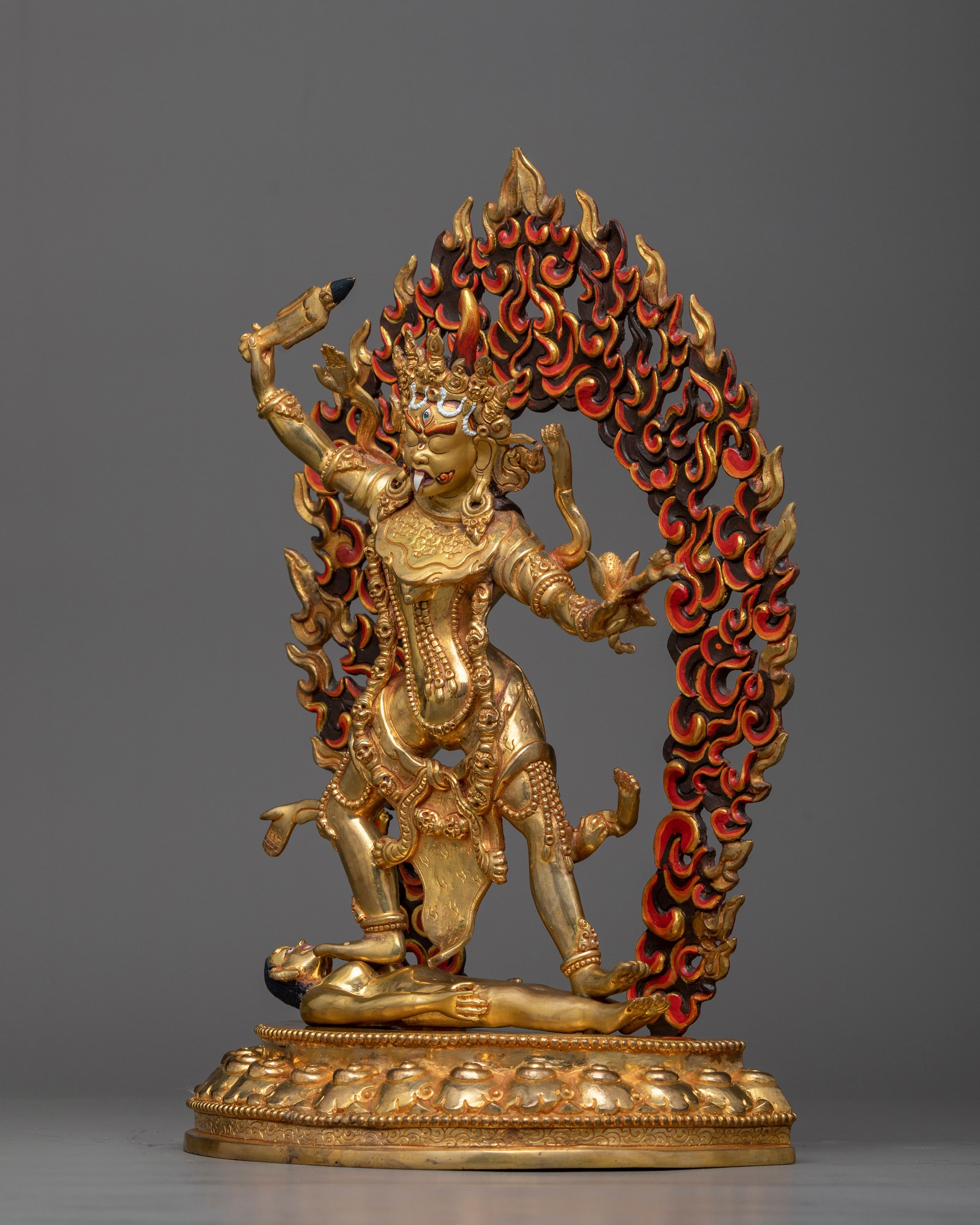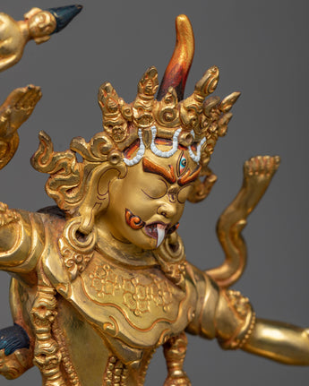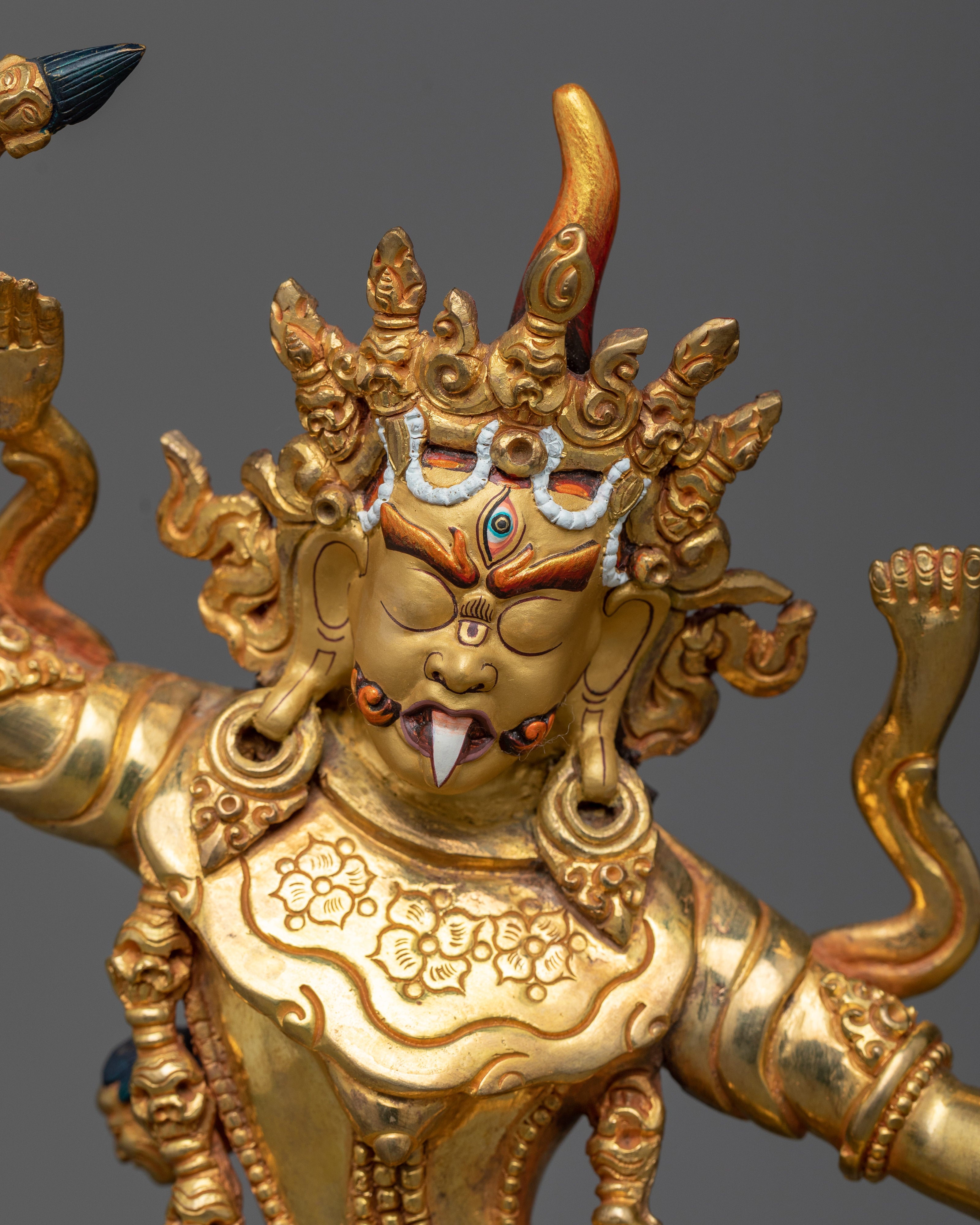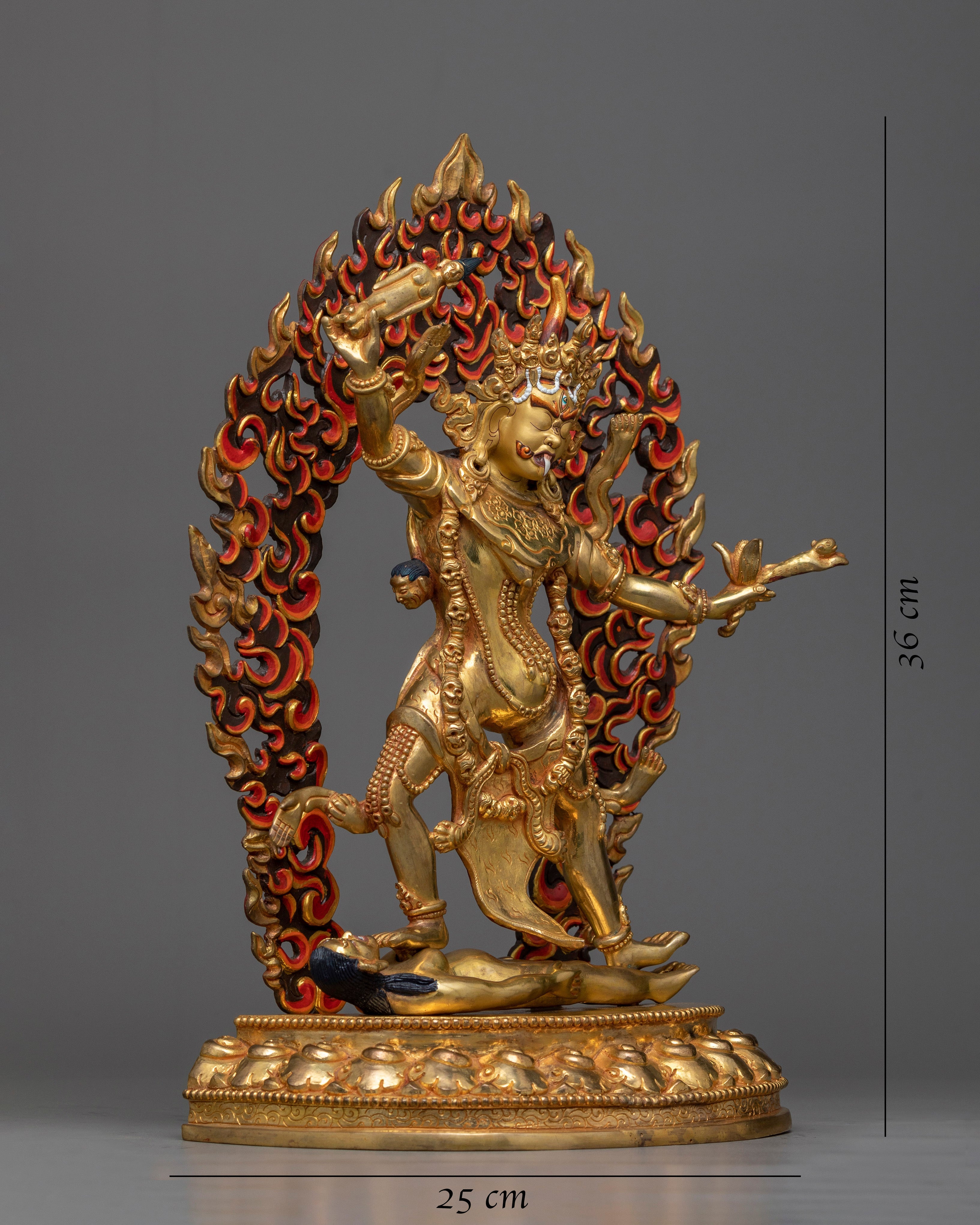 This statue is made of high-quality copper and lavishly gilded with 24K gold. Ekajati's dynamic posture, expressive features, and symbolic traits are highlighted by the precise application of gold and acrylic paintings. The towering grandeur of the statue is matched by the superb beauty and craftsmanship, making it a stunning addition to any spiritual place or collection.