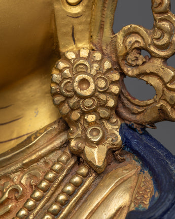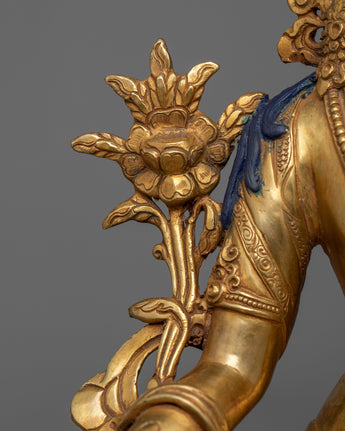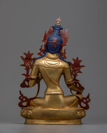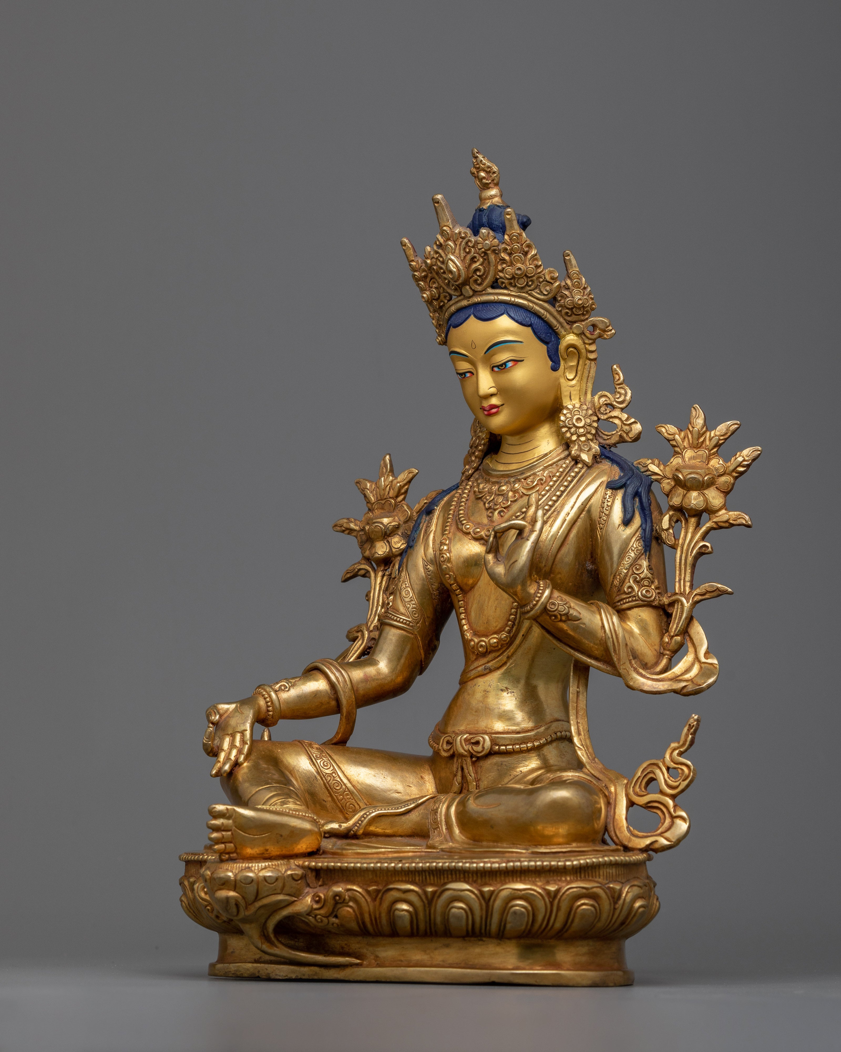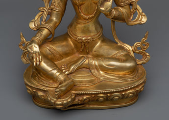 Embrace a paradise of peace and spiritual bliss with our Goddess Green Tara statue, a sought-after piece in our collection that represents a perfect synthesis of artistic prowess and spiritual depth. This beautifully created statue mixes the grandeur of 24k gold parts with brilliant acrylic paintings, all mounted on a durable copper body, to create an artifact that oozes grace and divinity.