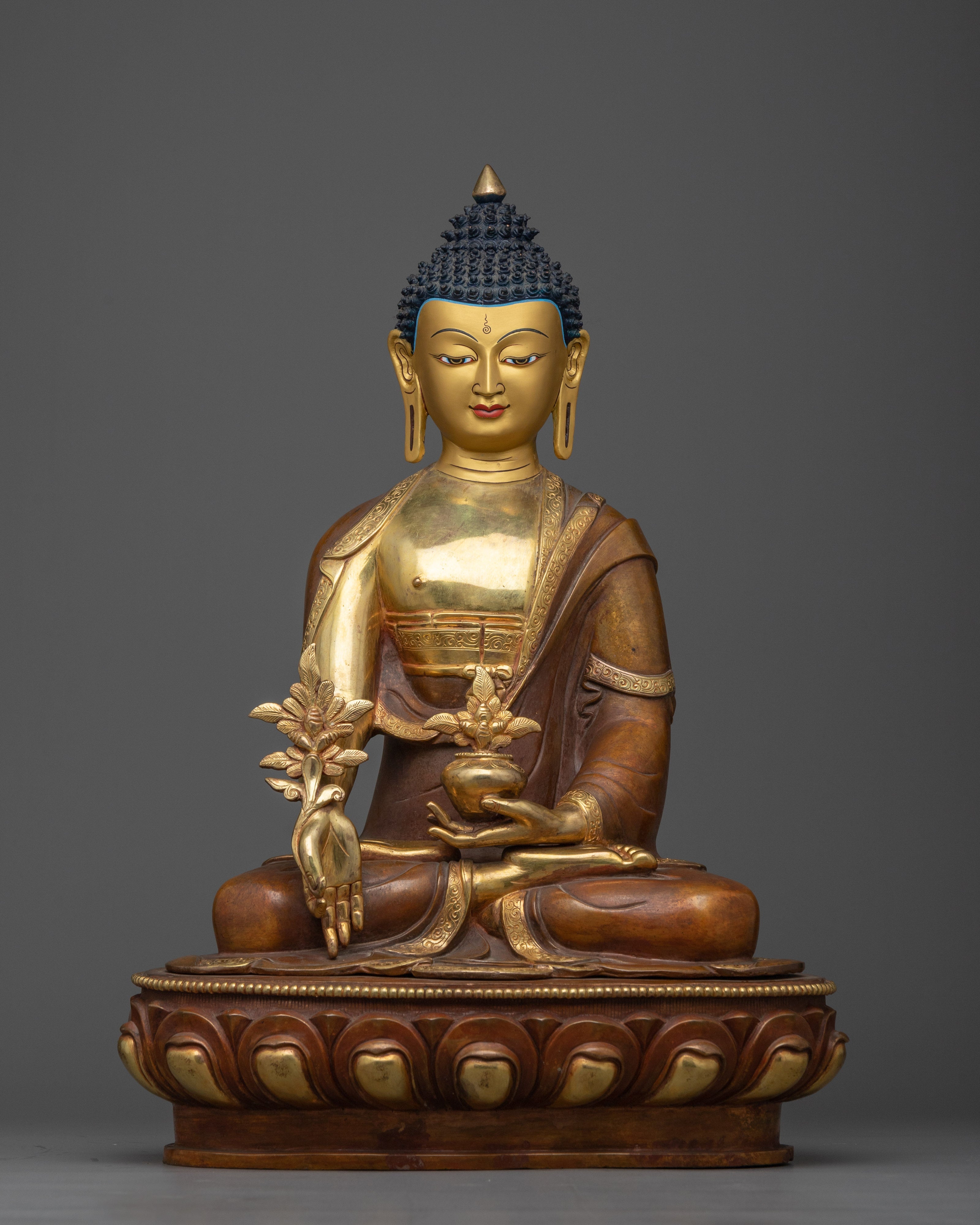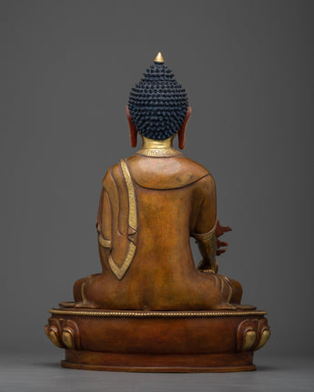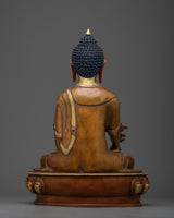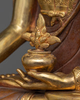 Our Medicine Buddha Sadhana Sculpture from the Collection is a wonderful fusion of divine artistry and peaceful spirituality. This enthralling piece is embellished with 24K gold gilding, emphasizing its divine presence, and is housed in an oxidized copper body, which adds timeless elegance and aged beauty.