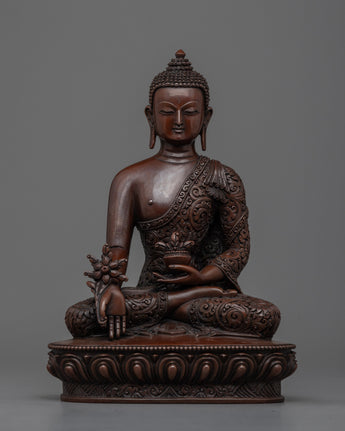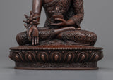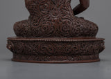 The placid looks and elaborate robes of each Buddha in this triad statue bring a sense of tranquility and wisdom to your home or meditation place. The rusted copper adds a rustic character to the statue's aesthetic appeal. The statue is an excellent complement to your spiritual journey since it serves as a powerful reminder of the Buddha's teachings on knowledge, compassion, and healing.