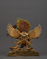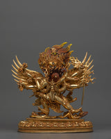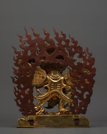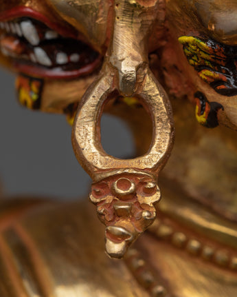 The Tibetan Phurba Deity Vajrakilaya Statue is a piece of spiritual artistry, standing at a height of 13 inches (33 cm) and featuring a base width of 10.8 inches (27.5 cm). Crafted with 24K gold gilding, complemented by gold and acrylic paintings and copper body. Vajrakilaya symbolizes the deity's power to remove obstacles and purify negative forces.