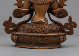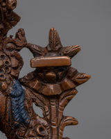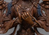 The Tishna Manjushri Namasangiti Practice Statue was hand-carved by our team, utilizing ancient Himalayan techniques. We are the skilled craftspeople of the Kathmandu Valley, and we have been producing classic Vajrayana sculptures for many years. The Manjushri is depicted seated on a moon-disc lotus seat with his left hand holding an utpala with a Prajnaparamita book resting on it and the right hand making the Dharma teaching motion with his two hands closer to his heart. Since we hand-carved the statue's oxidized copper body, the design, building, and polishing took us more than a month to accomplish. The elaborate geometric patterns were hand-carved using a hammer and tiny chisels.
