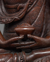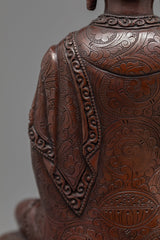 We hand-crafted the Amitabha Buddha Statue in our workshop using oxidized copper with the finest attention to detail. In the statue he is portrayed as having a serene countenance while seated on a lotus seat. His hands are on his lap, and he is carrying a vase filled with nectar of endless life. With the polished finishing of the statue, we sculpted the borders of the robe to provide straightforward yet subtle features. The robe is filled with intricate design patterns.