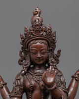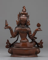 We hand-carved the Laxmi Ma Statue in the traditional Himalayan style in Nepal. The statue shows her sitting on a lotus seat. She has one face, four arms, and two legs. Her right hand is in the Abhaya mudra, and her left hand is in the Vitarka mudra. Her other hands hold sacred items. We used oxidized copper to mold the statue, then carved it by hand using a hammer and chisel. Only experienced artists can carve such detailed designs.