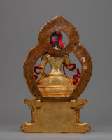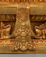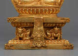 The Vajrasattva Chant Sculpture was expertly hand-carved in Nepal using traditional Himalayan art. We are the Kathmandu Valley artists whose skill in crafting vintage Vajrayana sculptures has been passed down through centuries. In this stunning art, a deity is represented serenely sitting atop a moon disc lotus throne. We diligently hand-carved the statue over a month, giving it a body of pure copper and gilding it with real 24k gold. His face and presence are illuminated by the magnificent halo and nimbus, which we have hand-carved intricate design patterns. We can assure you that the materials used to create this artwork are top-notch and will last for years.