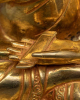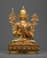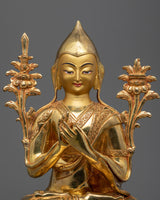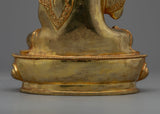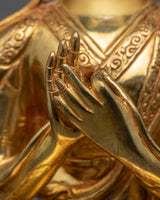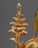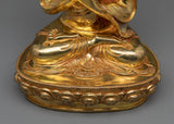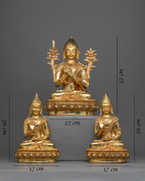 The Tsongkhapa a Buddha in the Land of Snows statue Set, includes the Je Tsongkhapa and his two disciples, Gyaltsab Je and Khedrup Je, both seated below. The statue set was identically carved in our studio in Nepal with exclusive design patterns. The set was molded from a copper body, gilded with 24k genuine gold over the body, and highlighted by acrylic paint. We have depicted all three deities seated atop a moon disc lotus with a peaceful expression as they make different mudras with their hands. The artists have worked for months to carve each individual statue with precise iconographic detail patterns that are exclusively found in Nepal. You can use this set for numerous religious activities as well as placing it on your altar.