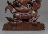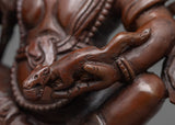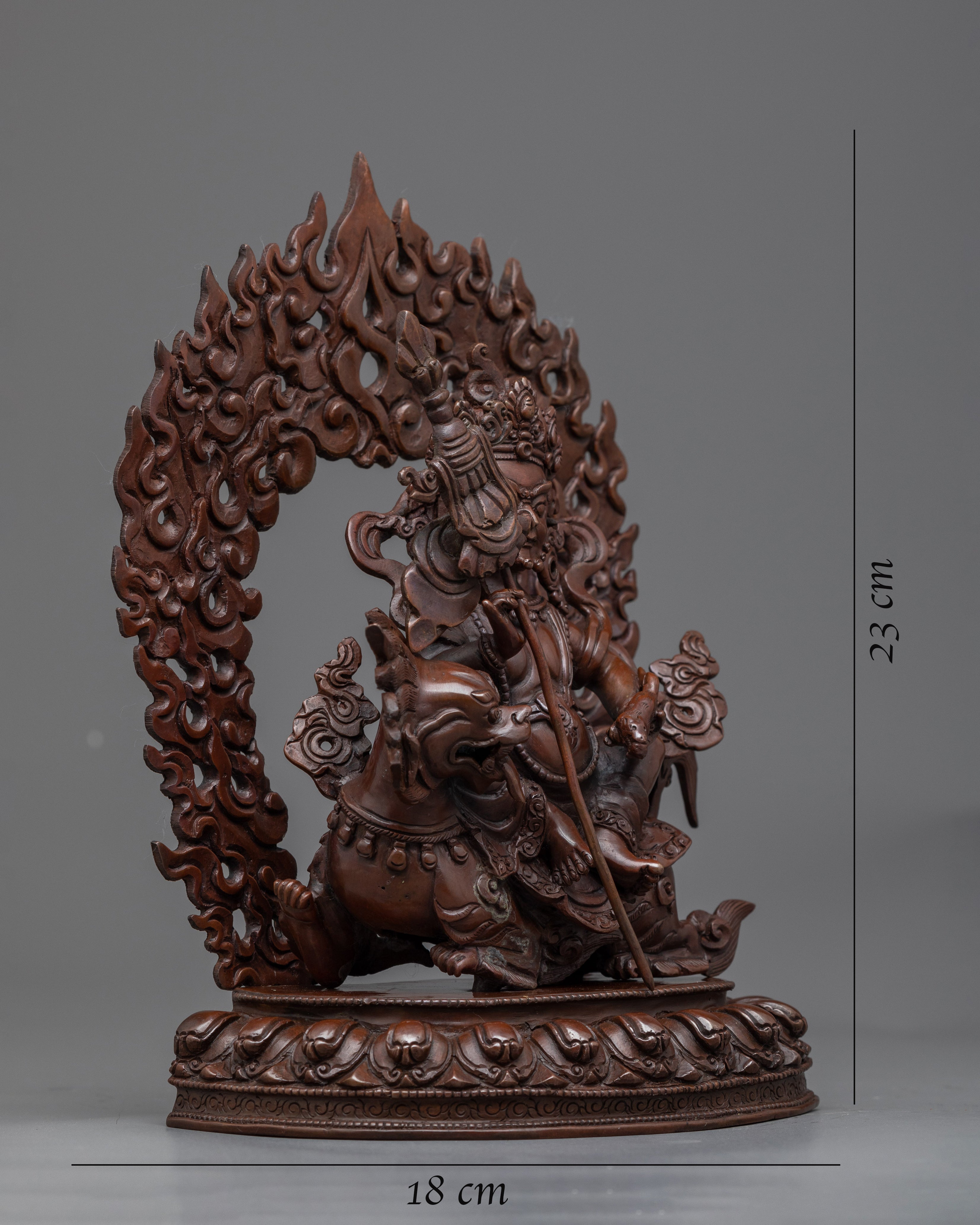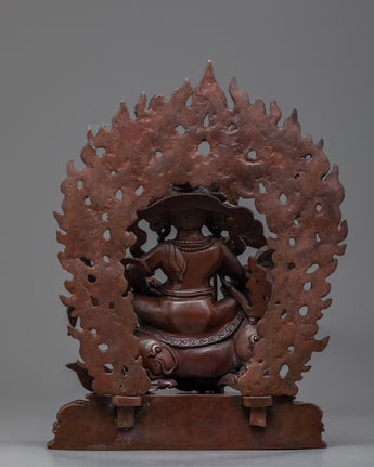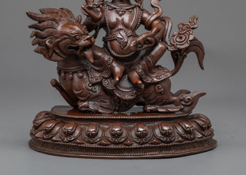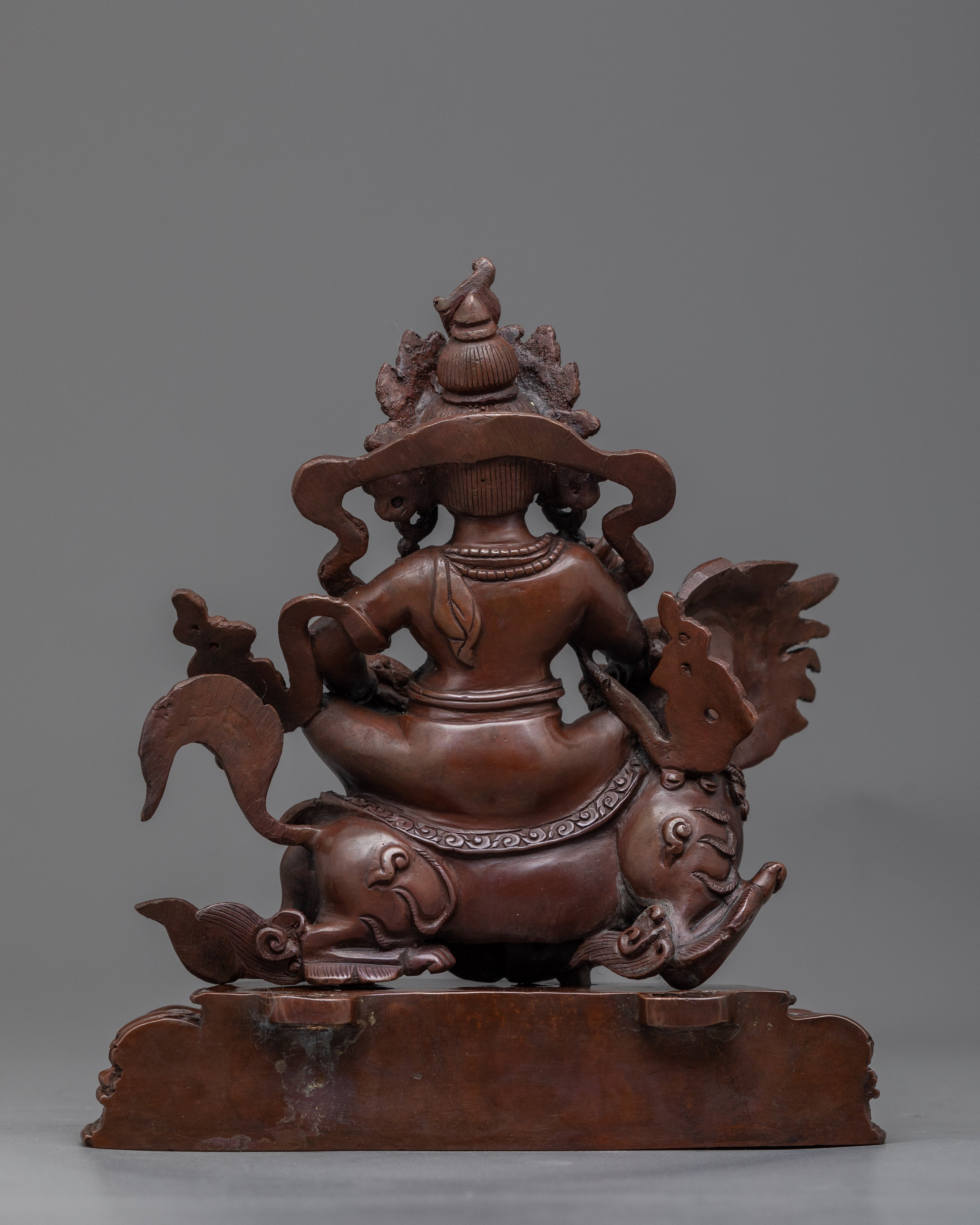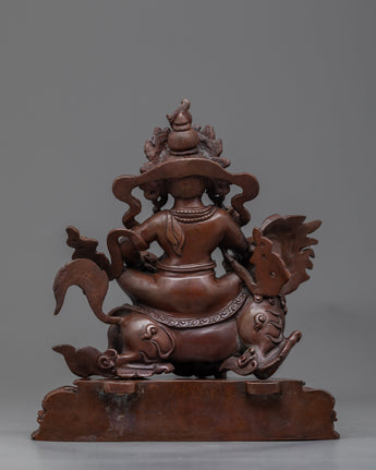 Travel through the spiritual worlds with Vaishravana's staunch protection, lovingly represented in this beautifully hand-sculpted statue. Each intricate detail, carved from deeply oxidized copper, echoes the delicate pulse of traditional Nepalese craftsmanship. The dusky patina, reminiscent of old treasures, evokes a powerful spiritual resonance.