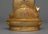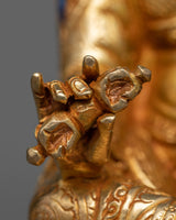 Embark on a spiritual journey with the Vajra Guru Padma Statue. This statue exudes spiritual wisdom and enlightenment. It is handmade with care, with 24K gold-gilded embellishments, gold and acrylic paintings, and a copper body.