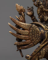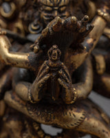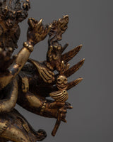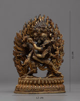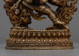 Utilizing the skillset passed down for centuries, we have exclusively sculpted this mesmerizing Vajrakilaya Practice Statue. Here we have portrayed the deity with his consort, Khorlo Gyedunma. He has 3 heads, 6 arms, and 4 legs. We meticulously hand-carved this intricate Yidam statue in our workshop using Nepalese Himalayan craftsmanship. We are a group of sculptors who have been practicing our craft for many years. He holds the magical phurba dagger with three blades with his two hands. One of the three main barriers to spiritual consciousness is removed by the three blades of the phurba dagger. We used an oxidized copper body to mold the figure and gilded it with genuine 24K gold. The antique finish gives this art an enthralling appearance.
