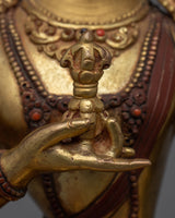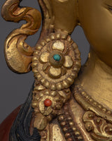 This Vajrasattva mantra practice statue is an intricately handcrafted piece produced in our studio and designed with unique Nepali motifs. In the statue, the Bodhisattva is depicted with his characteristic peaceful and calm countenance, seated in the lotus posture on a lotus flower seat that rests on a moon disk. He holds a vajra in his right hand, which symbolizes the unchanging nature of reality amidst impermanence, and a bell in his left hand, representing the wisdom of emptiness that resonates like sound. The figure is hand-carved out of oxidized copper and gilded with gold giving that elegant final look; the acrylic paint also enhances the overall beauty of the statue.