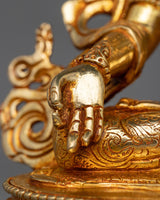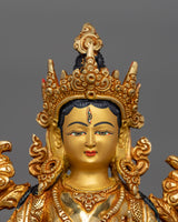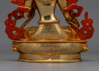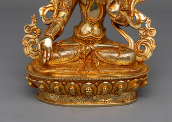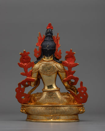 This handcrafted goddess with seven eyes, Green Tara stands 8.7 inches tall, has a base width of 6.7 inches, and weighs 1.46 kg. This statue, made of 24K gold gilded copper and embellished with gold and acrylic paintings, elegantly reflects the essence of White Tara, the Bodhisattva of compassion and longevity. This White Tara statue shows blessings of healing and compassion for those seeking spiritual growth.