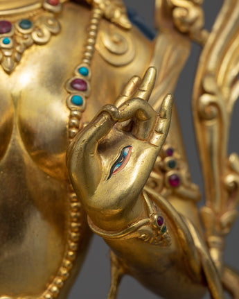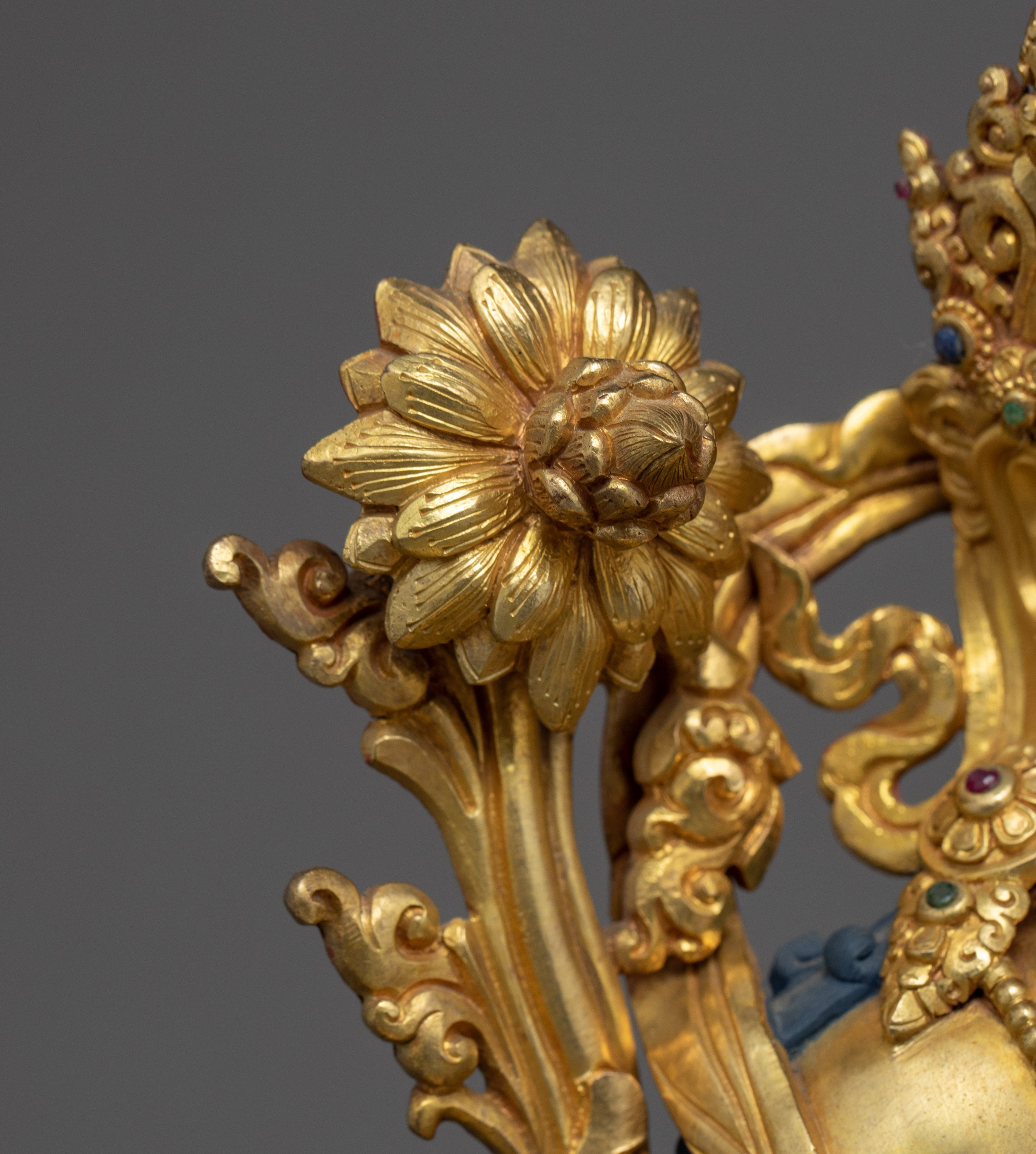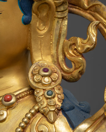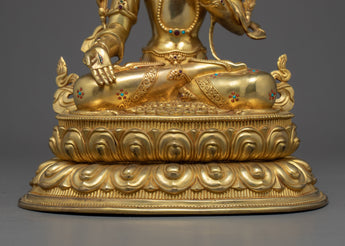 Traditionally crafted by the most skilled craftsmen in Nepal, this magnificent sculpture of the White Tara Buddha was hand carved from a copper body gilded with 24k genuine gold in our studio. The use of Acrylic painting highlights the statue to a greater extent giving it mesmerizing look. The deity sits atop a moon disc lotus with a peaceful and serene expression holding an utpala in her left hand while her right hand is rested upon her right knee. The statue is decorated with multiple ornaments and a crown embedded in precious jewels. You can use this figurine for different Buddhist rituals and regular practices such as meditation.
