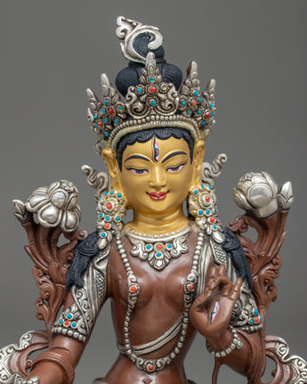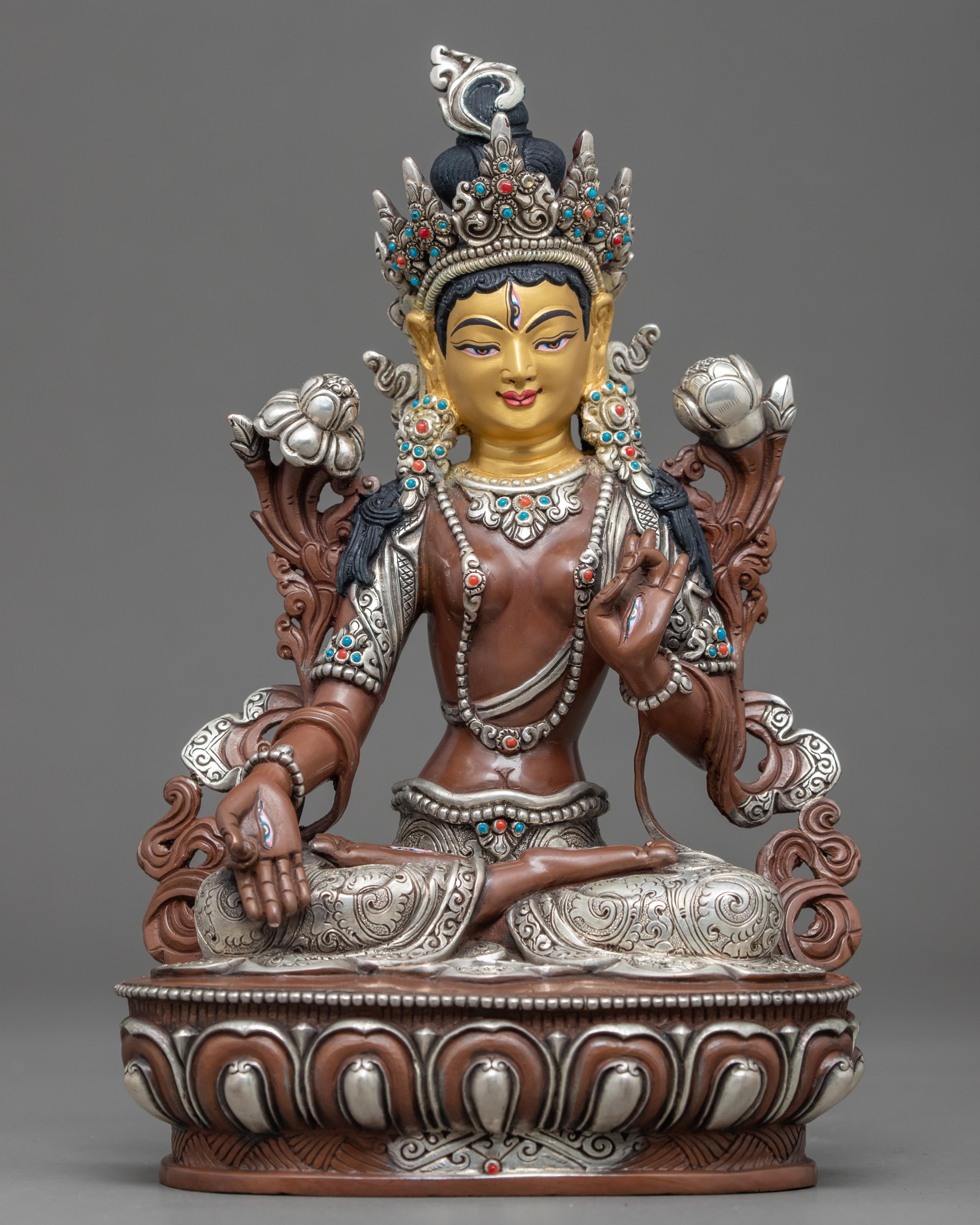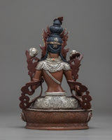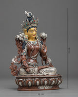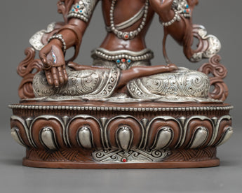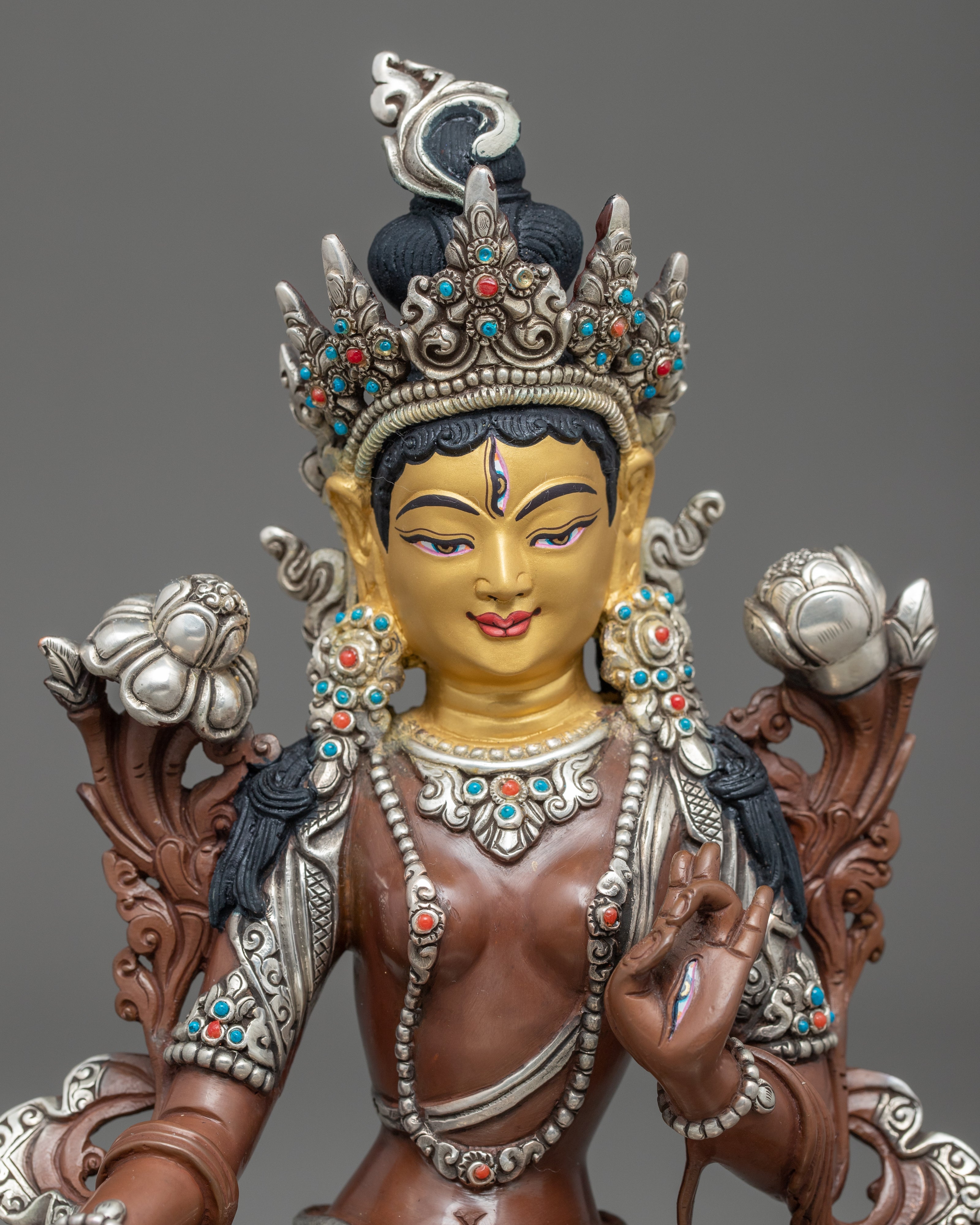 We have magnificently sculpted the statue of White Tara Buddha in an oxidized copper body, plated with bronze, and gilded the face with 24k gold. In this Mother Tara art, we have depicted her sitting on top of a moon disc lotus seat with a tranquil expression. We have adorned the crown with precious turquoise and corals and embellished the ornaments with valuable gemstones, which are rare in Vajrayana. We assure you that the materials used in this Tibetan figurine are of high quality and will endure for many years. You can efficiently utilize this art for various purposes, like in your regular meditational activities and even in different Buddhist traditions. This Himalayan figure will be a tremendous gift from Nepal to a practitioner like you.