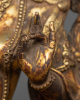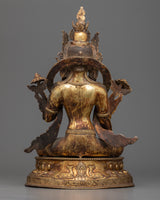 The sculpture is made of copper and has a rich 24K gold plating that adds a divine light that complements its tranquil disposition. The antique finish on the copper body gives the statue a timeless feel, emphasizing White Tara's elegance and grace. Its considerable size and weight make it a significant and calming presence, ideal for meditation spaces, home shrines, or as a centerpiece in areas dedicated to personal wellness and spiritual exploration.