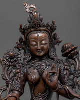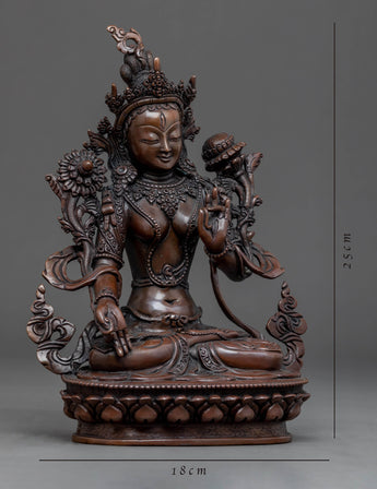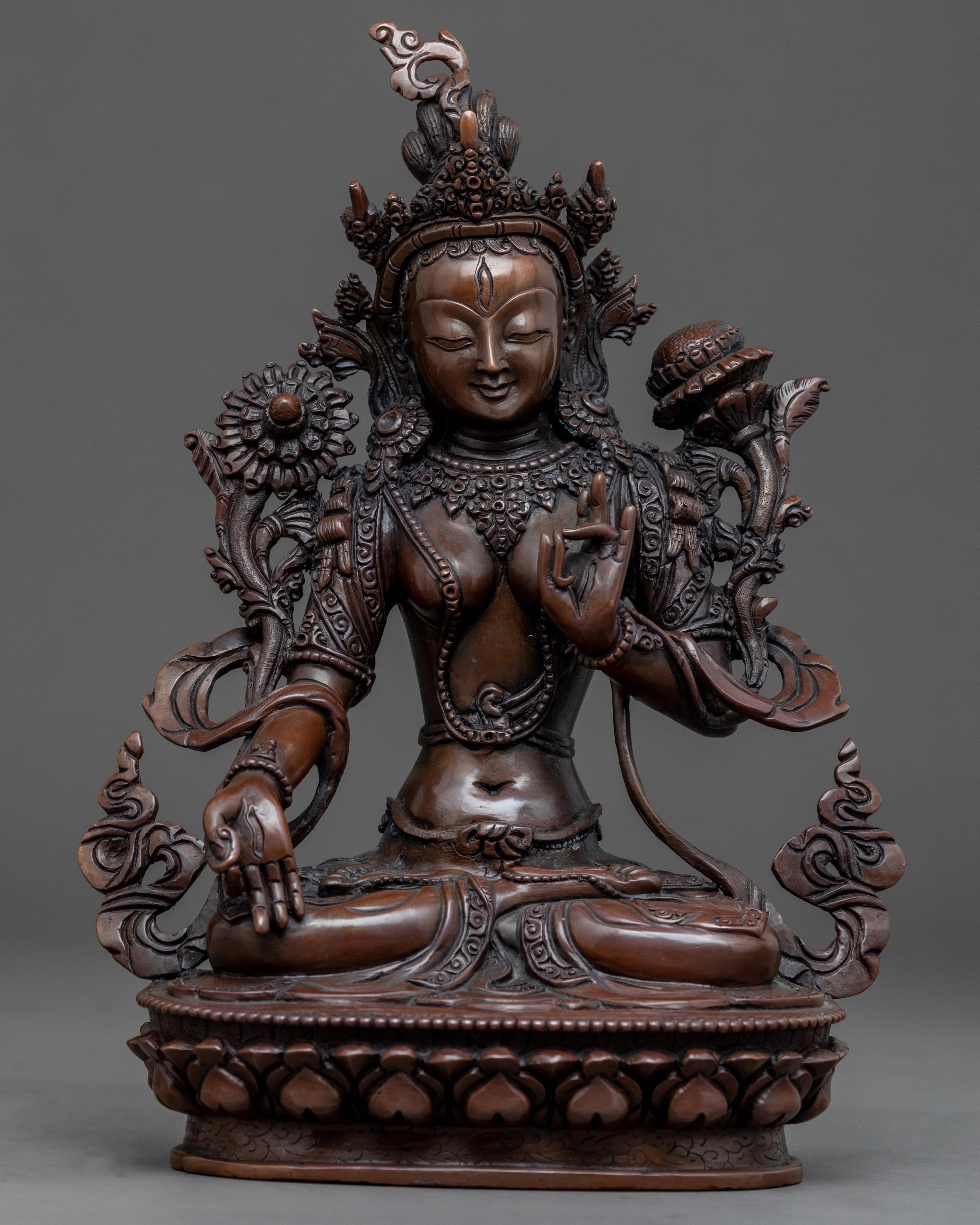 Traditionally hand-crafted, the White Tara Indoor Sculpture with flawless intricate design patterns is exclusively done in Nepal. The figure is mesmerizingly carved from a pure oxidized copper body in our studio. This Buddhist statue depicts the deity with a peaceful smile sitting on top of a moon disc lotus seat. She makes the mudra of Vitarka with her left hand and the mudra of earth-touching with her right hand while holding an utpala in both hands. This sculpture can be used in a variety of Vajrayana rituals as well as everyday meditation exercises. She is referred to as the seven-eyed Deity and is the personification of tranquility.