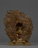 Sakya Mahakala is depicted standing on the top of a sun disc lotus seat with a wrathful expression. He holds a kartrika (flaying knife) in his right hand while carrying a kapala (skull cup) in his left hand, and the encircled fire flame engulfs his presence. The Nepali craftsman has finely detailed handcrafted the robe and the ornaments. This sculpture will be a tremendous gift from Nepal to a practitioner like you, representing his ability to consume negativity and ignorance.