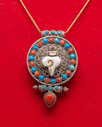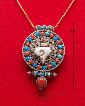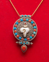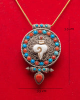 Tibetan Conch Shell Silver Ghau Pendant | Turquoise & Coral for Spiritual Significance
