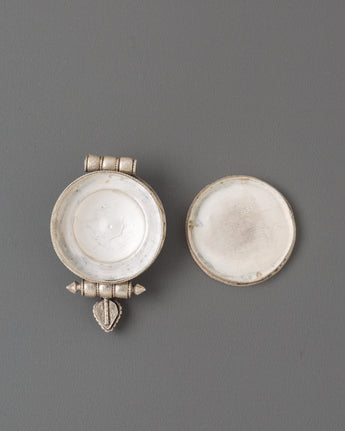 This pendant is inspired by the Dharma Wheel, a key symbol in Buddhist teachings. The Dharma Wheel Silver Ghau Pendant is a popular meditation and prayer tool that serves as a reminder of the path to enlightenment and personal progress. The modest but substantial design allows it to house spiritual goods or prayers, giving it a unique way to carry a piece of one's spiritual journey. It is lightweight, weighing only 0.020kg, and can be worn on a regular basis as part of one's daily spiritual practice.