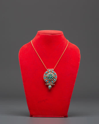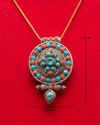 The Dharma Wheel Silver Ghau Pendant exemplifies meticulous craftsmanship and spiritual profundity. This pendant, at 5.5 cm in height and 3.5 cm in breadth, is the ideal size for individuals looking for a meaningful yet stylish accessory. This pendant is made of silver and embellished with imitation turquoise and coral stones, creating a striking contrast of brilliant blue and rich red, symbolizing inner balance and calm. The combination of these materials emphasizes the pendant's artistic appeal and spiritual importance.