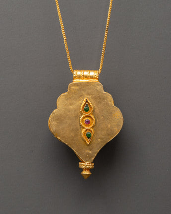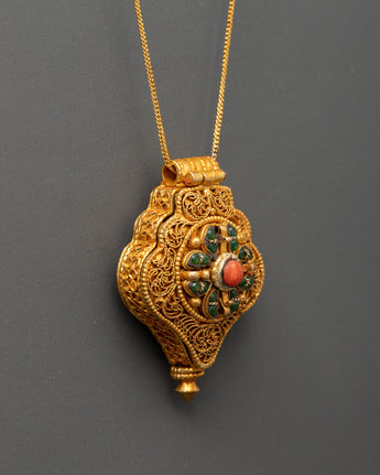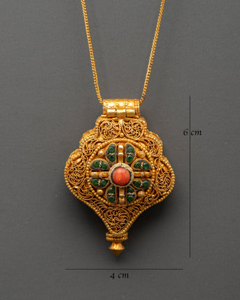 With its compact size, this item is perfect for meditation practitioners, spiritual artifact collectors, or anyone who wishes to carry a symbol of divine protection with them. Whether worn as a necklace or displayed on an altar, it serves as a reminder of the Buddha's teachings and the path to enlightenment. The gold-plated filigree work and coral centerpiece create a unique and visually striking ornament that harmonizes spiritual significance with aesthetic beauty.