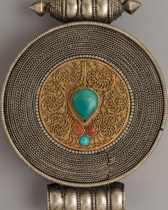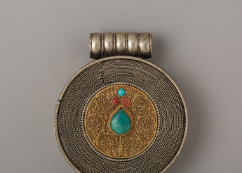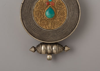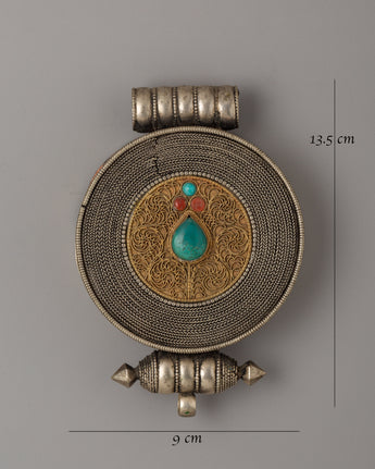 Measuring 13.5 cm in height and 9 cm in width, this compact and wearable locket is perfect as a protective charm or for holding sacred relics. The original turquoise and coral stones enhance their beauty and bring spiritual meaning, helping the wearer connect with their energy. This Ghau Box Locket represents balance, wholeness, and spiritual alignment, making it a valuable addition to any sacred space or spiritual practice. With its harmonious design and deep symbolism, it serves as a reminder of protection, healing, and unity.