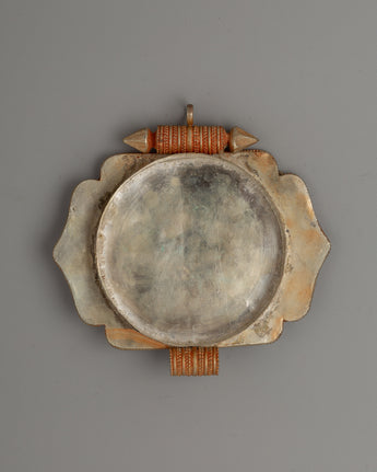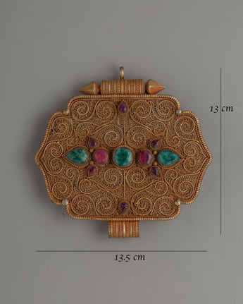 The filigree work around the stones is expertly crafted, featuring elegant swirling patterns that enhance the locket’s beauty and fine artistry. This delicate detailing reflects exceptional craftsmanship, giving the piece a refined and timeless appeal. Traditionally, ghau lockets were used in Tibetan culture to store sacred relics or artifacts. This sacred locket can be worn as a personal amulet or placed in a spiritual space for protection and connection to the divine. Though lightweight at only 0.18 kg, it carries immense spiritual and artistic value, making it a meaningful addition to any collection.