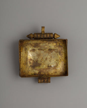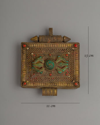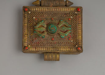 The intricate filigree work wraps around the box, adding depth and texture to its surface. This delicate technique involves twisting and curling metal threads to create a flowing, elegant pattern that enhances the overall design. The locket measures 13 cm in height and 11 cm in width and weighs 0.21 kg, making it graceful and practical. Traditionally, Ghau Boxes are used to store sacred artifacts or mantras, serving as both a spiritual protector and a cherished piece of art. With its beautifully carved Vajra, intricate gold filigree, and gemstone accents, this locket is a timeless treasure—perfect for a shrine, altar, or personal collection.
