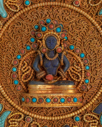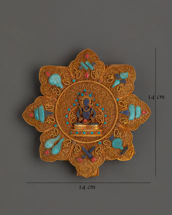 Enhance your spiritual practice with this Handcrafted Tibetan Ghau Box Locket, a stunning showcase of Himalayan skill and dedication. It features a solid copper body that has been richly gold-plated and is delicately embellished with brilliant turquoise, coral, and lapis lazuli stones. This 14cm by 14cm ghau box is embellished with intricate filigree work that elegantly frames a focal image of a calm and compassionate deity figure.